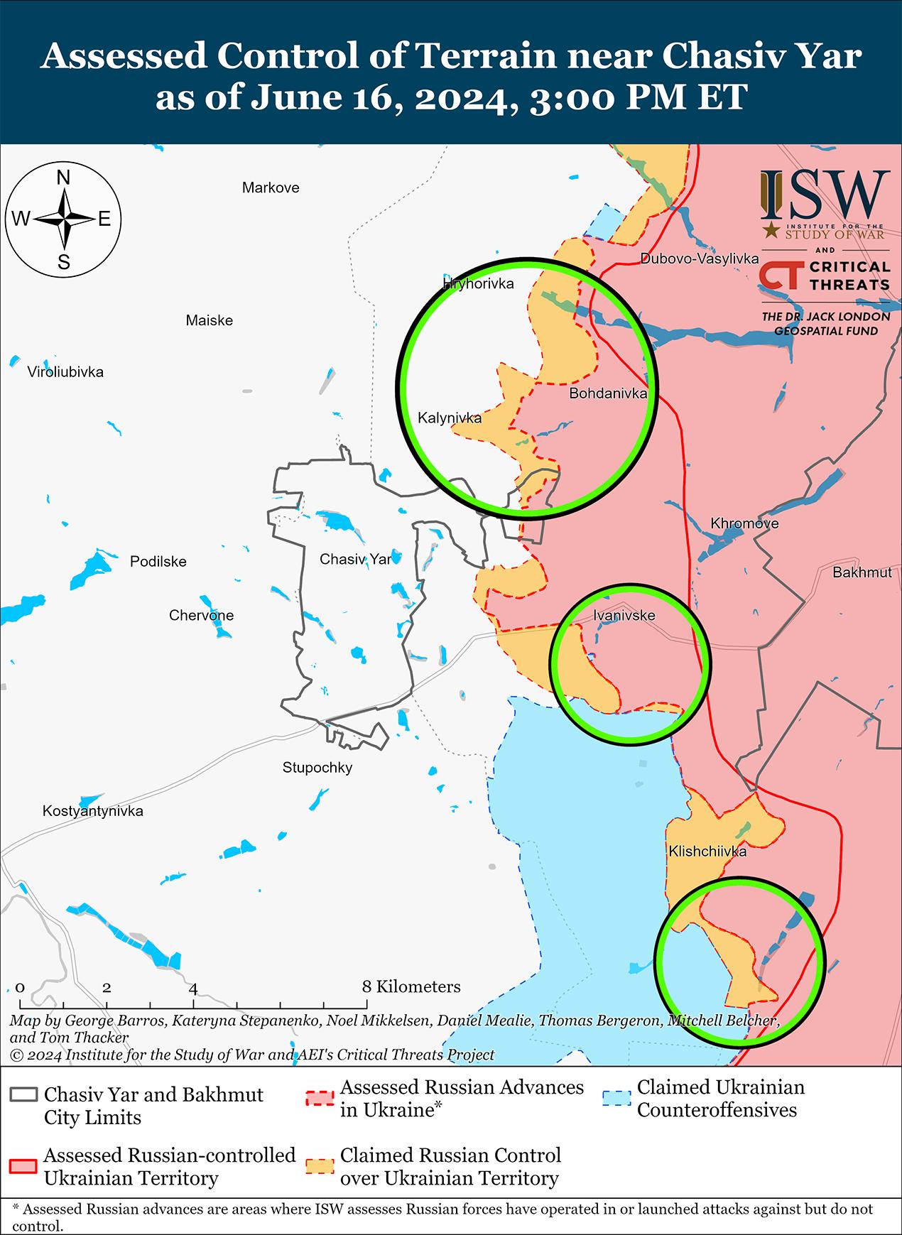 16 июня враг продолжил наступательные действия на Часовом направлении, но подтвержденных успехов не добился. Российский блогер заявил, что российские войска продвинулись в лесном массиве к юго-западу от Богдановки (к северо-востоку от Часового Яра), но ISW пока не обнаружил визуальных доказательств российской активности в этом лесном массиве. [42] Российские военные блогеры утверждали, что российские войска наносят массированные удары, в том числе термобарическими артиллерийскими системами, по зданиям в западном микрорайоне Канал (самый восточный Часов Яр) для подготовки к будущим штурмам. [43] Украинский Генштаб сообщил о безуспешных атаках россиян к северу от Часового Яра в районе Григовики; восточнее Часового Яра в районе Ивановского; и юго-восточнее Часового Яра в районе Клещеевки и Андреевки 15 и 16 июня. [44] Сообщается, что на направлении Часов Яр продолжают действовать подразделения 98-й воздушно-десантной дивизии (ВДВ) и бригады «Север-В» (Российский добровольческий корпус). [45]