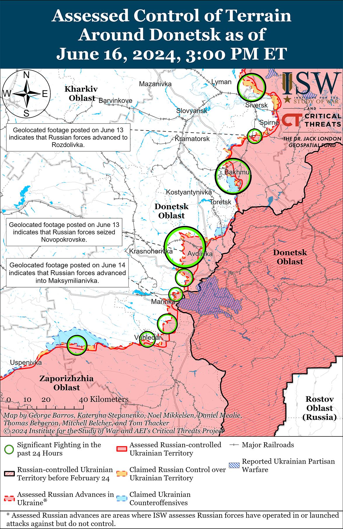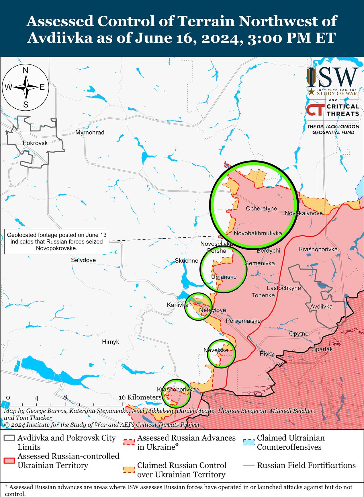 16 июня враг продолжил наступательные действия на Авдеевском направлении, но подтвержденных успехов не добился. Российские военные блогеры утверждали, что российские войска продвинулись в направлении Новоселовки Первой и в районе Сокола (оба к северо-западу от Авдеевки), а также на северном и южном берегах Карловского водохранилища (юго-западнее Авдеевки). [46] Один из блогеров утверждал, что российские войска продвинулись на глубину до 650 метров вдоль улицы Набережной в районе Новоалександровки (северо-западнее Авдеевки); глубиной 500 метров в лесопосадочной полосе южнее Новопокровского (северо-западнее Авдеевки); и 1,1 километра в глубину на фронте 1,64 километра в направлении Нетайлово-Яснобродовка (с юго-запада на запад от Авдеевки). [47] Однако ISW пока не обнаружил визуальных подтверждений ни одного из этих российских заявлений. Украинский Генштаб сообщил о российских атаках к северу от Авдеевки в районе Калиново; северо-западнее Авдеевки в районе Новоалександровки, Евгеновки, Новоселовки Первой, Очеретино, Воздвиженки; западнее Авдеевки в районе Уманского; и юго-западнее Авдеевки в районе Невельского 15 и 16 июня. [48]