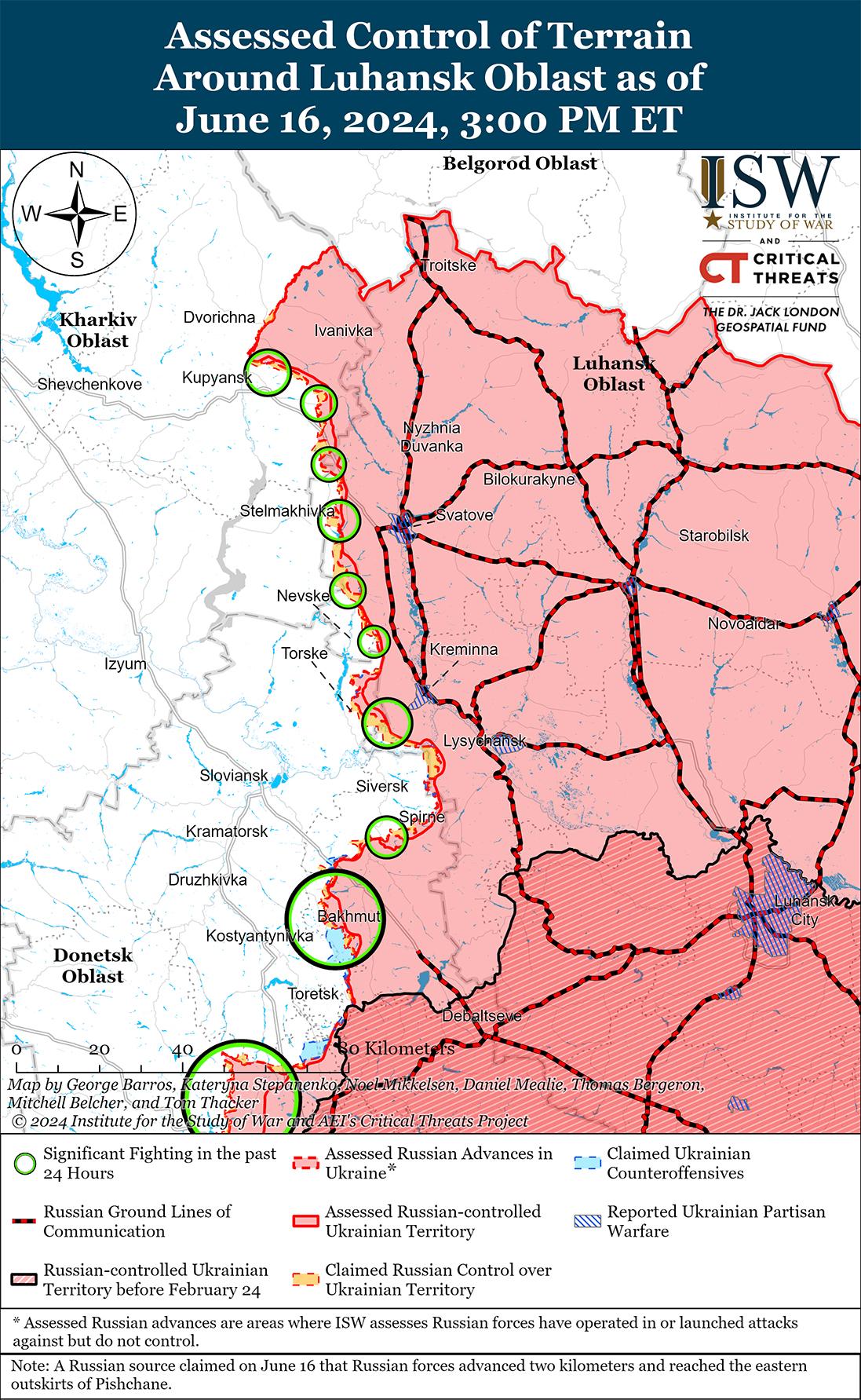 16 июня российские войска продолжили наземные атаки вдоль линии Купянск — Сватово — Кременная, но подтвержденных изменений на линии фронта не было. Российский блогер заявил, что российские войска продвинулись примерно на два километра вглубь к восточной окраине Песчаного (юго-восточнее Купянска), хотя ISW не обнаружил визуальных доказательств этого заявления. [37] Украинская бригада сообщила, что украинские войска продвинулись на один километр вглубь на фронте два километра в районе Серебрянского лесничества (юго-западнее Кременной). [38] Бои продолжались к востоку от Купянска в районе Петропавловки; юго-восточнее Купянска в районе Песчаного и Берестовой; западнее Сватово в районе Андреевки; северо-западнее Кременной вблизи Макеевки, Дружелюбовки, Грековки и Невского; и юго-западнее Кременной в Серебрянском лесничестве 15 и 16 июня. [39] Сообщается, что подразделения 2-й российской артиллерийской бригады (2-й армейский корпус Луганской Народной Республики) действуют в районе Берестовой. [40]