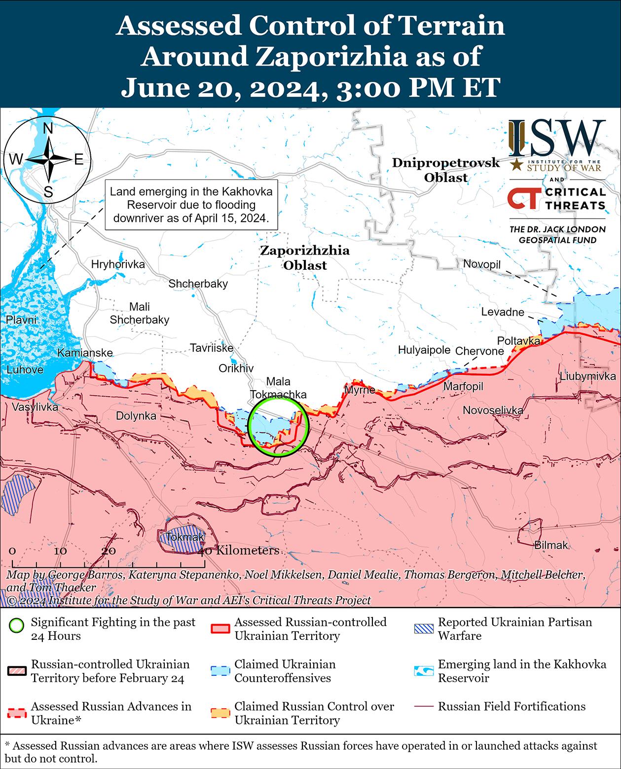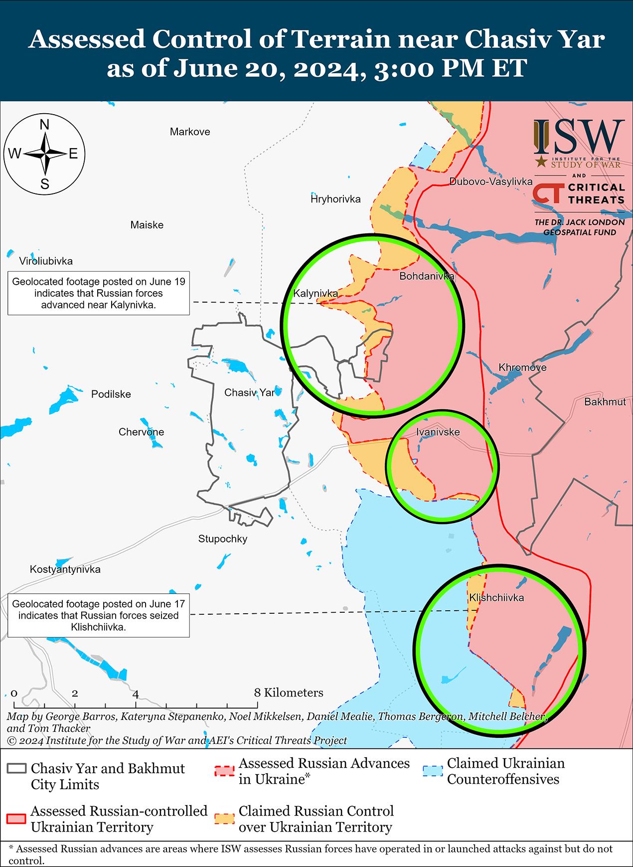 Недавно российские войска продвинулись к каналу Северский Донец-Донбасс к северу от Часового Яра. Геолоцированные кадры, опубликованные 19 июня, свидетельствуют о том, что российские войска продвинулись к берегу канала Северский Донец-Донбасс в центре Калиновки (к северу от Часового Яра) в районе, где канал проходит под землей. [74] Если российские войска смогут должным образом использовать это наступление, они могут атаковать Часов Яр с севера и угрожать украинским позициям в центральной части Часового Яра, не прибегая к противодействию пересечению канализированной местности для входа в населенный пункт. Российские войска до сих пор не смогли пересечь канал там, где он проходит над землей в микрорайоне Канал (самый восточный Часов Яр). Российские военные блогеры также сообщили о успехах россиян в районе канала в Калиновке. [75] Спикер украинской Хортицкой группировки войск подполковник Назар Волошин 20 июня отметил, что российские войска возобновили лобовые атаки тяжелой пехоты на направлении Часов Яр после того, как в последнее время понесли большие потери во время неудачных механизированных штурмов. [76] Российские и украинские источники сообщали о продолжении боев в микрорайонах Канал и Новый (самый восточный Часов Яр); северо-восточнее Часового Яра в районе Богдановки; восточнее Часового Яра в районе Ивановского; и юго-восточнее Часового Яра в районе Клещеевки и Андреевки 19 и 20 июня. [77] Сообщается, что под Часовым Яром ведут бои подразделения 88-й добровольческой бригады «Эспаньола». [78]