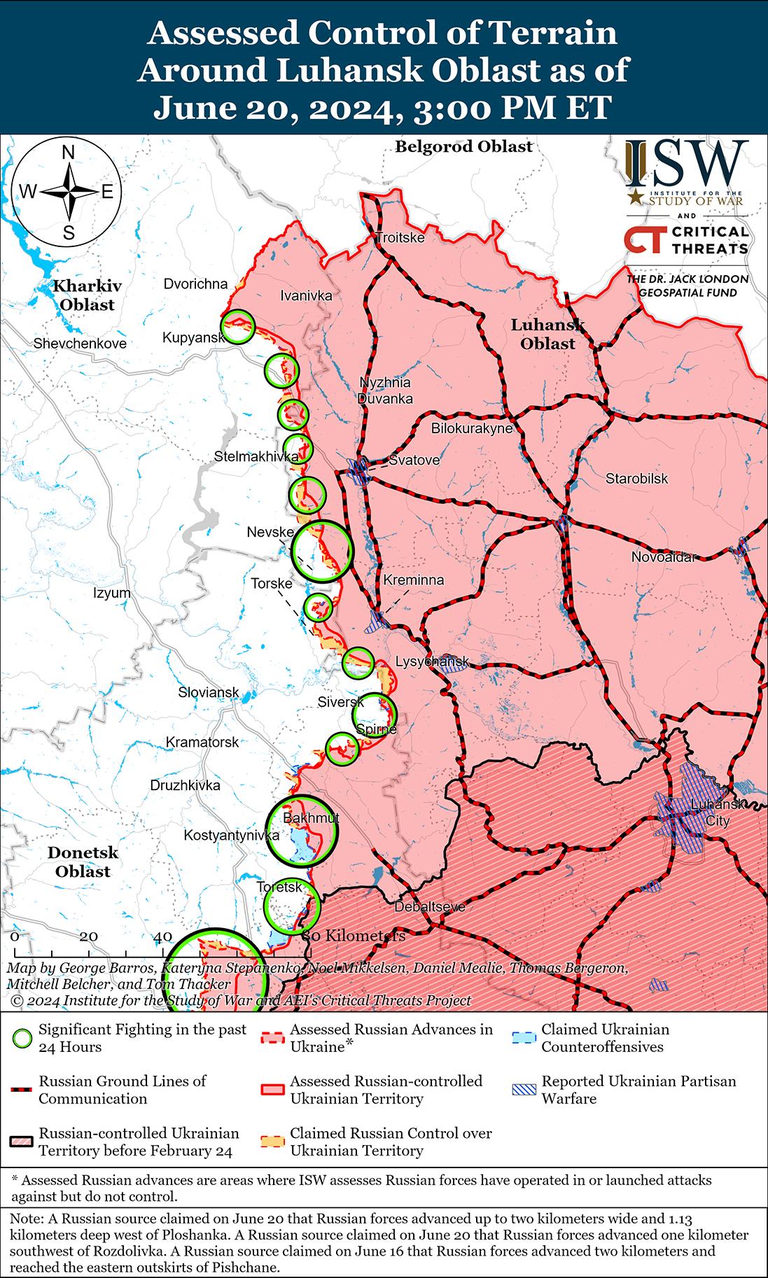 Украинские силы недавно продвинулись к северо-востоку от Волчанска (к северо-востоку от Харькова) на фоне продолжающихся российских и украинских атак к северу и северо-востоку от города 20 июня. Геолоцированные кадры, опубликованные 20 июня, свидетельствуют о том, что украинские силы недавно отбили несколько позиций к северо-востоку от Волчанска и продвинулись вдоль улицы Соборной на севере Волчанска. [60] Российский блогер утверждал, что российские войска наносили удары по украинским позициям вдоль улиц Гоголя и Олеси Досвитной в центре Волчанска, а ISW в последнее время не наблюдал доказательств того, что российские позиции в этом районе центра Волчанска устойчивы, что позволяет предположить, что украинские силы удерживают позиции в этом районе, несмотря на предыдущие заявления России. [61] Блогер также утверждал, что российские войска захватили два здания на территории Волчанского агрегатного завода, однако ISW не обнаружил визуальных подтверждений этому заявлению. [62] Другой российский военный блогер утверждал, что российские войска удерживают позиции примерно в 300 метрах от реки Волчья в неустановленном районе Волчанска. [63] Другой российский военный блогер утверждал, что российские войска продвинулись на 1,55 км в направлении Тихого (непосредственно к востоку от Волчанска), а украинский Генштаб сообщил, что украинские силы отбили российские атаки в районе Тихого, что подтверждает предыдущие российские сообщения о том, что украинские силы отбили населенный пункт. [64] Спикер украинской Хортицкой группировки войск подполковник Назар Волошин сообщил, что с утра 20 июня российские атаки в районе Волчанска стали менее интенсивными. [65] Российские военные блогеры утверждали, что российские войска также отражали украинские контратаки на Липцынском направлении (севернее Харькова), в том числе в районе Глубокого (севернее Харькова). [66]