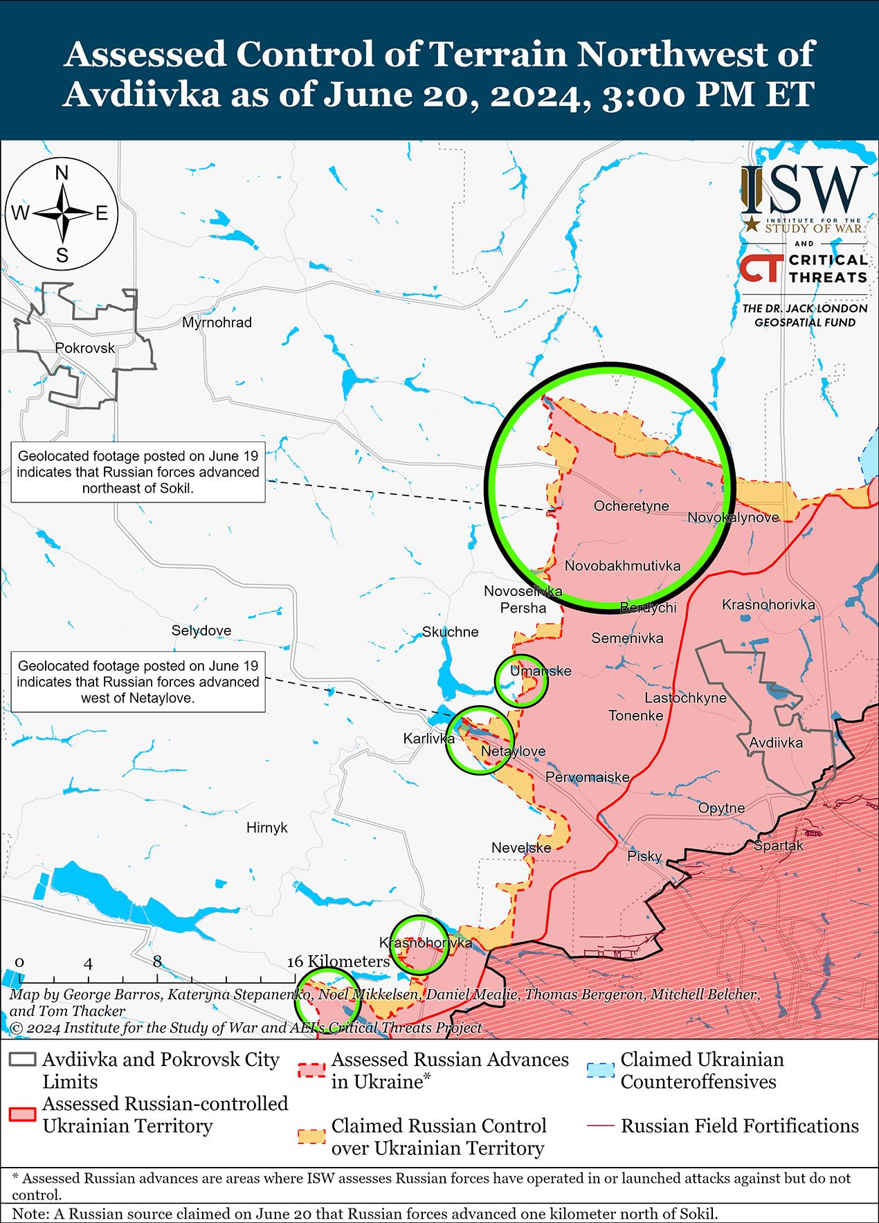 Недавно российские войска продвинулись к северо-западу и юго-западу от Авдеевки. Геолоцированные кадры, опубликованные 20 июня, показывают, что российские войска добились незначительных успехов на южном берегу Самойловой балки к северо-востоку от Сокола (к северо-западу от Авдеевки), что в целом согласуется с заявлениями России о продвижении российских войск в районе этого оврага к северу от Сокола. [81] На дополнительных геолоцированных кадрах, опубликованных 19 июня, видно, что российские войска продвинулись на северном берегу Карловского водохранилища (юго-западнее Авдеевки), а 20 июня военные блогеры также сообщали о российских успехах в районе водохранилища. [82] Российские военные блогеры также утверждали, что российские войска продвинулись на окраинах Карловки и к западу от Нетайлова (к югу от Карловского водохранилища и к юго-западу от Авдеевки), а также в районе Яснобродовки (к западу от Авдеевки), однако ISW не обнаружил визуальных доказательств этих заявлений. [83] Волошин отметил, что российские войска используют меньше бронетехники в атаках к западу от Авдеевки, чем раньше, и теперь полагаются на небольшие группы легкой пехоты, использующие квадроциклы или мотоциклы, чтобы упростить передвижение по лесополосам и ветрозащитным районам. [84] Российские войска проводили наземные атаки к северу от Авдеевки в районе Калиново; северо-западнее Авдеевки в районе Очеретино, Александрополя, Новоалександровки, Евгеновки, Сокола, Воздвиженки и Новоселовки Первой; и юго-западнее Авдеевки в районе Карловки 19 и 20 июня. [85]