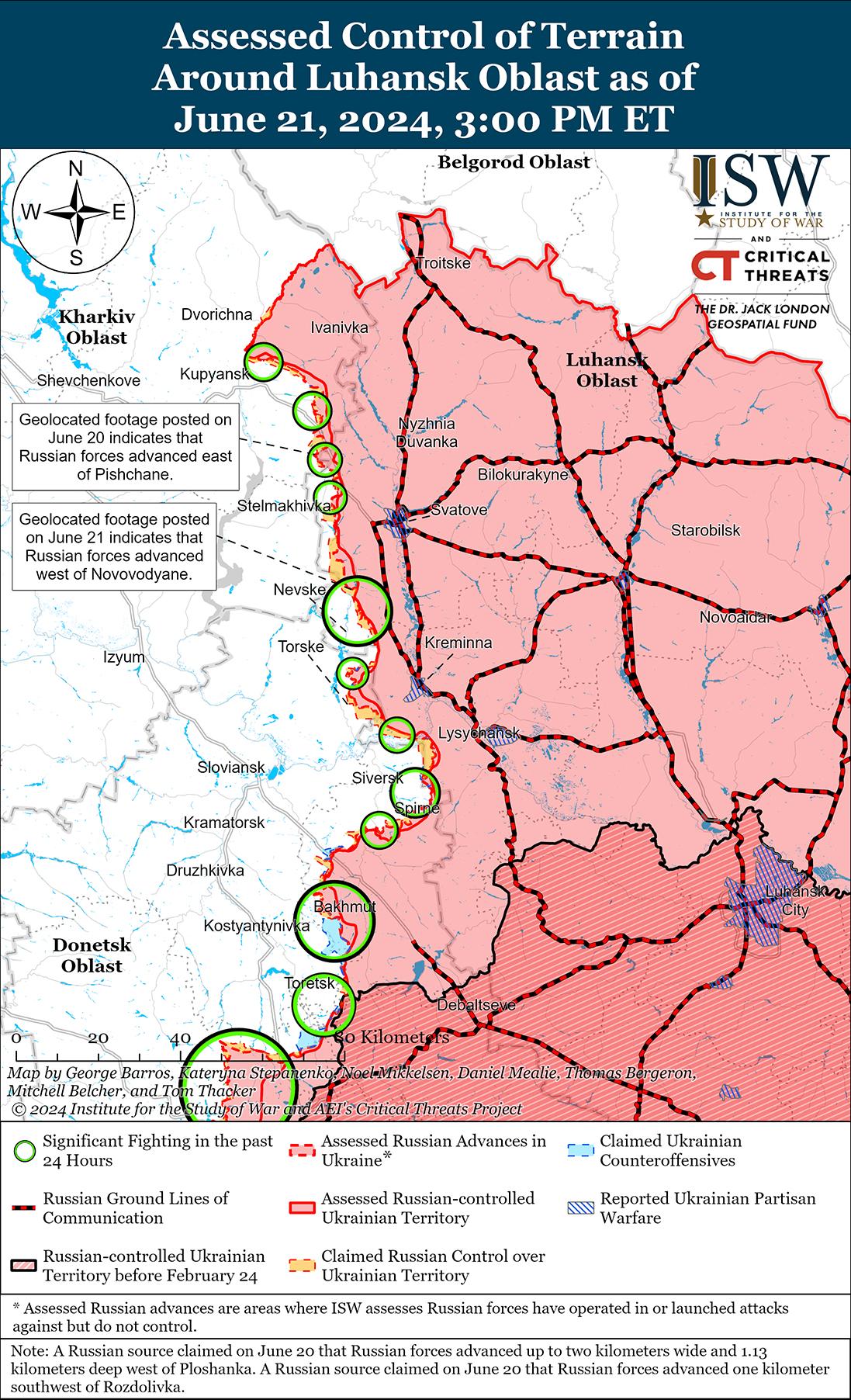 Недавно российские войска продвинулись вдоль линии Купянск-Сватово-Кременная на фоне продолжающихся российских наземных атак в этом районе 21 июня. Геолоцированные кадры, опубликованные 20 июня, свидетельствуют о том, что российские войска недавно продвинулись к востоку от Песчаного (юго-восточнее Купянска). [36] Дополнительные геолоцированные кадры, опубликованные 21 июня, свидетельствуют о том, что российские войска недавно продвинулись к западу от Нововодяного (юго-западнее Сватово). [37] Бои продолжались северо-восточнее Купянска в районе Синьковки; юго-восточнее Купянска в районе Степной Новоселовки, Песчаного и Берестового; северо-западнее Сватово в районе Стельмаховки; северо-западнее Кременной вблизи Новосадового, Грековки и Невского; и южнее Кременной в Серебрянском лесничестве 20 и 21 июня. [38] Официальный представитель Главного управления военной разведки (ГУР) Украины Андрей Юсов заявил, что российские войска пытаются перебросить резервы на Боровское направление (к западу от Сватово), но не формируют в этом районе новые «мощные» штурмовые группы, которые могли бы реально угрожать украинской обороне на Боровском направлении. [39]