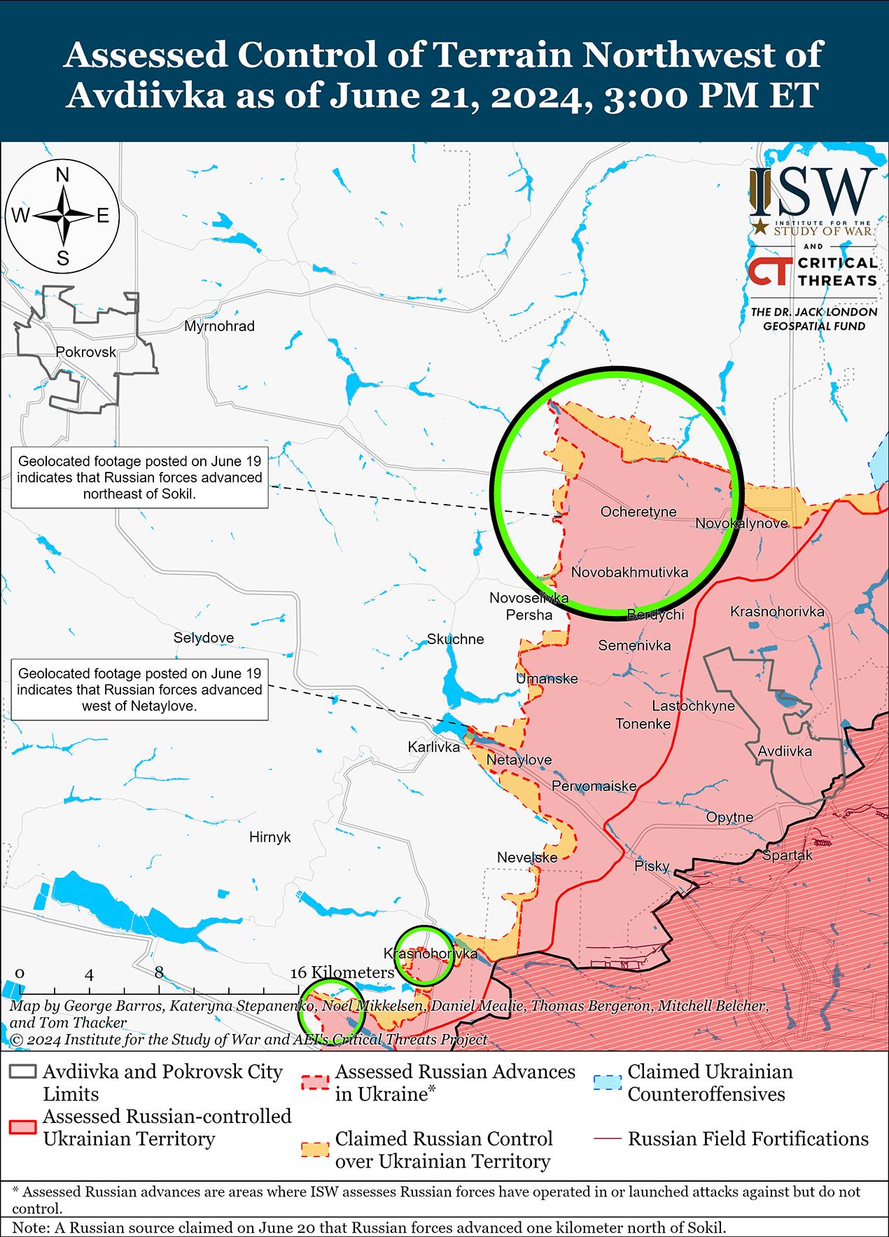 21 июня враг продолжил наступательные действия в районе Авдеевки, однако подтвержденных изменений линии фронта на этом участке не было. Враг продолжил наступательные действия к северо-западу от Авдеевки в районах населенных пунктов Воздвиженка, Архангельское, Новоалександровка, Сокол, Новопокровское и Новоселовка Первая; западнее Авдеевки в районе Яснобродовки; и юго-западнее Авдеевки в районе Карловки 20 и 21 июня. [48] Российские военные блогеры утверждали, что российские войска продвинулись на северном берегу Карловского водохранилища и к западу от Нетайлова (оба к юго-западу от Авдеевки), однако ISW не обнаружил визуальных подтверждений этих заявлений. [49]