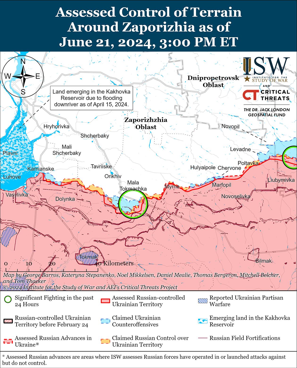 21 июня продолжались позиционные бои на участке границы Донецкой и Запорожской областей в районах населенных пунктов Старомайорское и Урожайное (южнее Великой Новоселки). [54] 21 июня Генштаб Вооруженных сил Украины сообщил, что российские войска нанесли удары управляемыми планирующими бомбами по Новоукраинке (восточнее Великой Новоселки). [55] Сообщается также, что в последнее время российские войска усилили удары планирующими бомбами по Старомайорскому, возможно, в рамках подготовки к будущим наземным атакам в районе населенного пункта. [56] По имеющимся сведениям, в приграничной зоне Донецкой и Запорожской областей действуют подразделения российской 14-й бригады спецназа (ГРУ). [57]