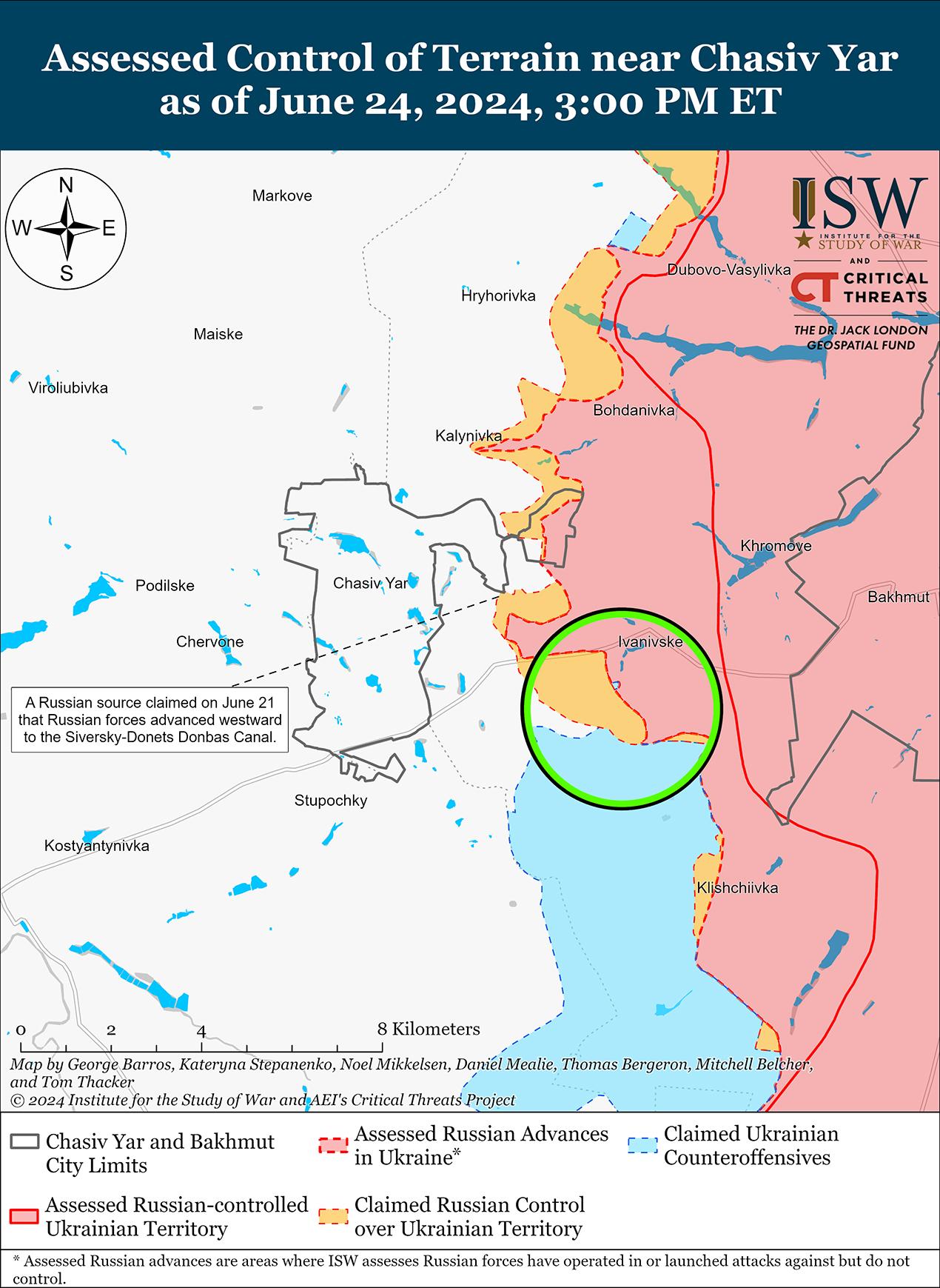 24 июня враг продолжил наступательные действия в районе Часового Яра, однако подтвержденных изменений на линии фронта не было. Российские военные блогеры утверждали, что российские войска продвинулись в районе между Часовым Яром и Калиновкой (к северу от Часового Яра) и в направлении канала Северский Донец-Донбасс от Ивановского (к западу от Часового Яра), хотя ISW не обнаружил визуальных доказательств этих заявлений. [49] Бои продолжались в районе Часового Яра, в микрорайоне Канал (самый восточный Часов Яр), к западу от Часового Яра в районе Ивановского и к северу от Часова Яра в районе Калиновки. [50] Сообщается, что подразделения российской 98-й дивизии ВДВ продолжают действовать в микрорайоне Канал. [51]