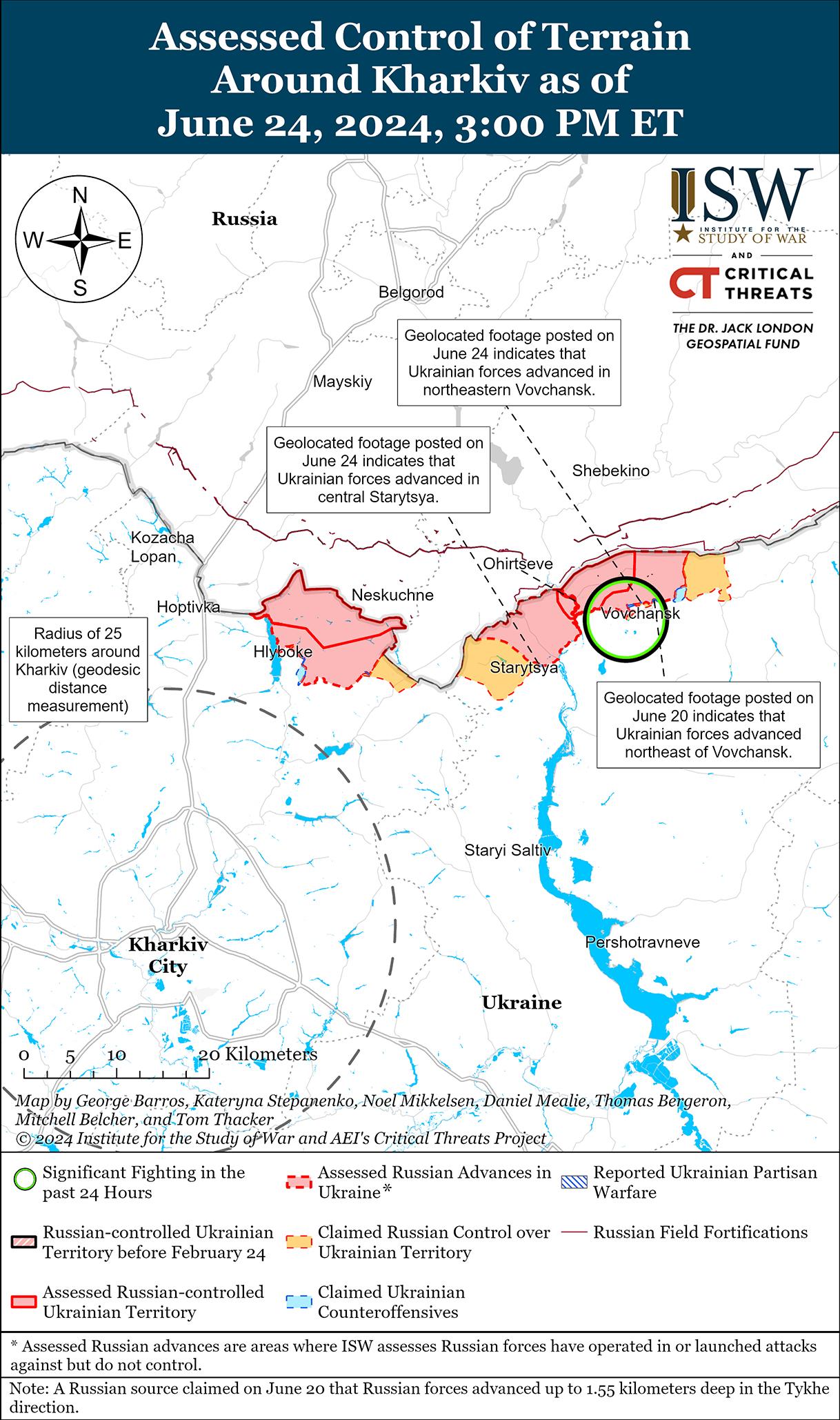 Украинские силы контратаковали и недавно отвоевали некоторые тактические позиции к северо-востоку от Харькова. На геолоцированных кадрах, опубликованных 24 июня, видно, что украинские войска ведут огонь из стрелкового оружия по российским войскам на северо-востоке Волчанска (к северо-востоку от Харькова), что указывает на то, что украинские силы вернули ограниченные позиции вдоль улицы Хилобороба. [39] На геолоцированных кадрах, опубликованных 24 июня, также видно, что украинские войска вернули себе позиции в центральной части Старицы (северо-восточнее Харькова и юго-западнее Волчанска). [40] Российские военные блогеры, однако, утверждали, что украинские силы безуспешно контратаковали к северу от Харькова в районе Глубокого и в направлении Липцы; и в Волчанске 23 и 24 июня. [41] По имеющимся сведениям, российские войска продолжали наступление вблизи и в районе Волчанска, продолжались позиционные бои в районе Глубокого. [42] Российский военный блогер заявил, что в районе Глубокое действуют неназванные разведывательные подразделения Балтийского флота России. [43]