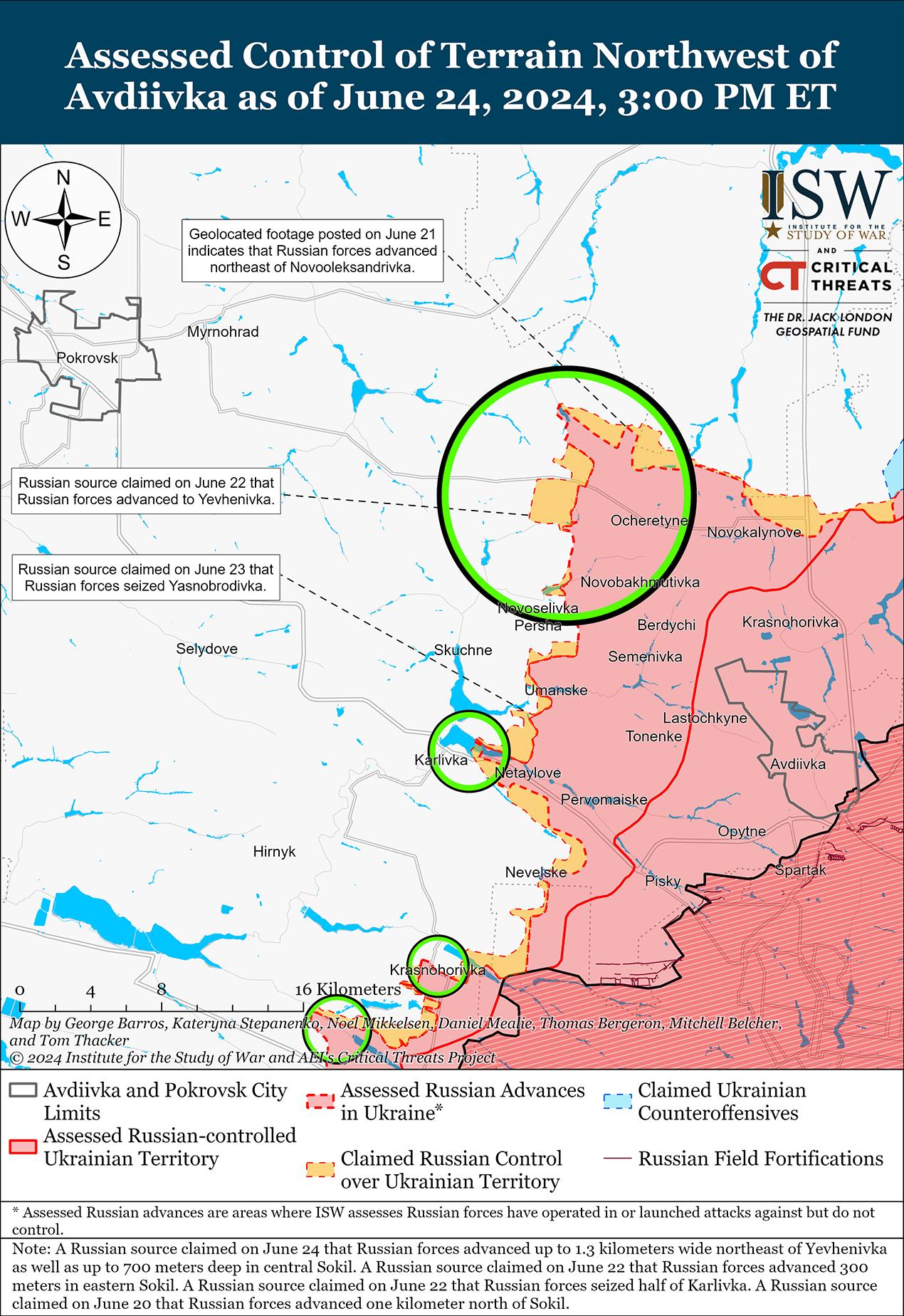 Российские источники утверждали, что российские войска продвинулись к северо-западу от Авдеевки 24 июня на фоне продолжающихся российских наземных атак в этом районе. Российские военные блогеры утверждали, что российские войска продвинулись к северу от Новоалександровки (северо-запад Авдеевки), на глубину до 700 метров (к северо-западу от Авдеевки) в центре Сокола, и на участке по фронту до 1,3 километра в восточной части Евгеновки (к северо-западу от Авдеевки и к западу от Сокола), хотя ISW не обнаружил визуальных доказательств этих заявлений. [54] Центр стратегических коммуникаций ВСУ (СтратКом) сообщал, что российские войска контролируют большую часть, но не всю Новоалександровку, и что в населенном пункте продолжаются ожесточенные бои. [55] Ранее, 23 июня, несколько российских блогеров утверждали, что российские войска захватили Новоалександровку. [56] 23 и 24 июня российские войска продолжали наступать северо-западнее Авдеевки в районах населенных пунктов Воздвиженка, Александрополь, Новоселовка Первая, Новопроковское и Очеретино и западнее Авдеевки в районе Карловки и Нетайлова. [57]