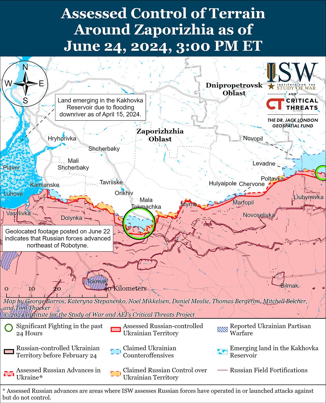 Сообщается, что 24 июня российские войска продолжили наступательные действия в районе Малой Токмачки (северо-восточнее Работино). [63] Российские источники утверждали, что позиционные бои продолжались в районе Работино и северо-западнее Вербовое (к востоку от Работино), но отмечали, что ситуация на линии фронта на западе Запорожской области не изменилась. [64] Один из блогеров утверждал, что российские войска продвинулись в районе Новопокровки (северо-восточнее Работино). [65] Российский военный блогер утверждал, что разведывательные подразделения 70-го мотострелкового полка (42-я мотострелковая дивизия, 58-я общевойсковая армия, Южный военный округ [ЮВО]) предупреждали об эффективных украинских минных работах на западе Запорожской области. [66] Операторы беспилотников «Ланцет» отряда «Викингов» 22-й отдельной гвардейской бригады спецназа (ГРУ Генштаба ВС РФ) действуют в направлении Камышеваха (юго-восточнее Запорожья). [67]