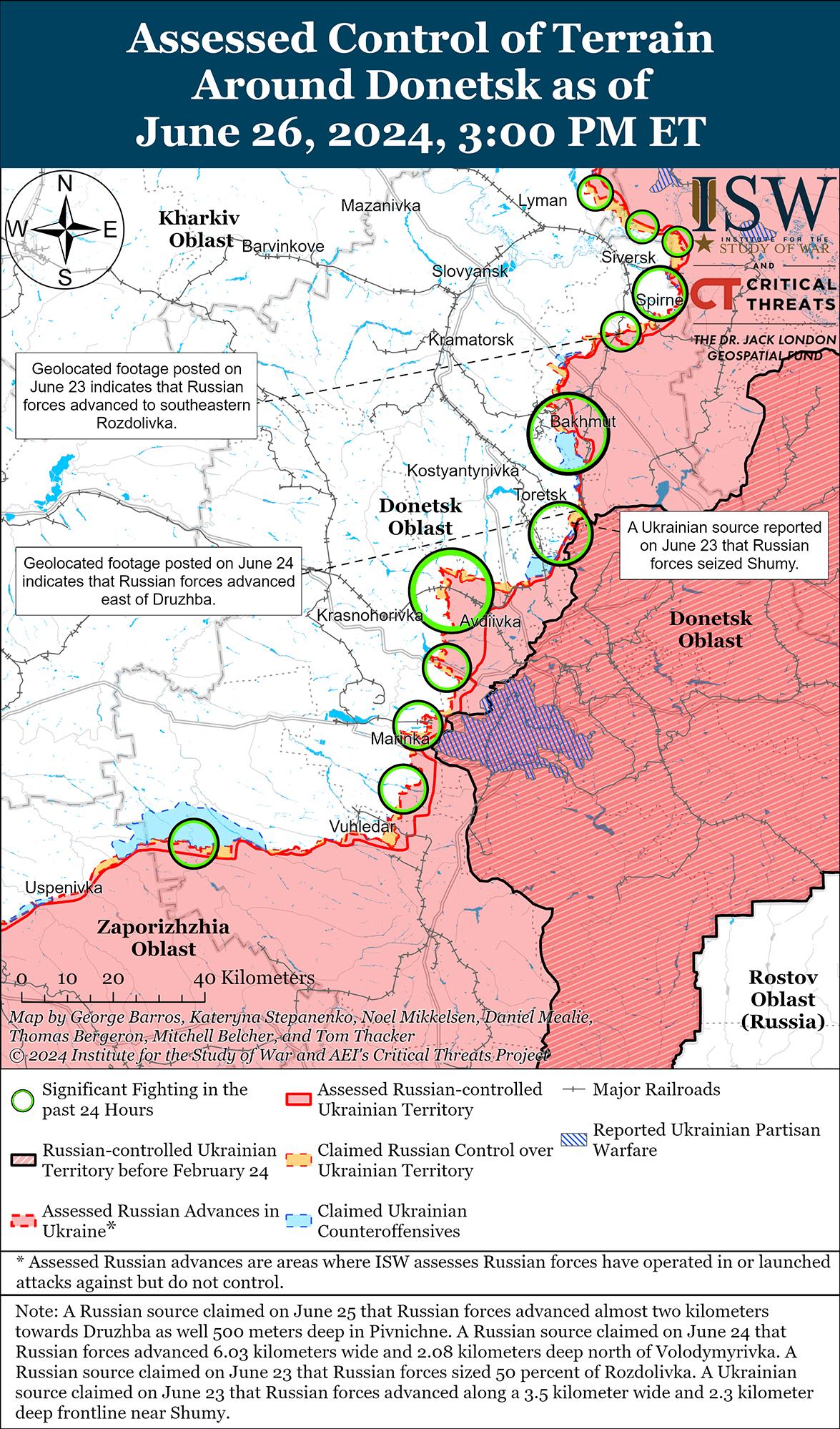 Сообщается, что российские войска недавно продвинулись вперед на фоне продолжающихся боев под Торецком 26 июня. 25 и 26 июня российские военные блогеры утверждали, что российские войска продвинулись от 800 метров до двух километров в глубину от Майорского до Дружбы (оба к востоку от Торецка); продолжали наступление на Ню-Йорк (южнее Торецка) с юга; и продвинулись на 500 метров вглубь в районе Северное (восточнее Торецка). [59] ISW не обнаружил подтверждения этих заявлений. Один из блогеров распространил заявление о том, что российские войска добились этих успехов, воспользовавшись ротацией украинских войск. [60] 26 июня российские войска также атаковали вблизи Железного (юго-восточнее Торецка) и Дачного (северо-восточнее Торецка). [61]