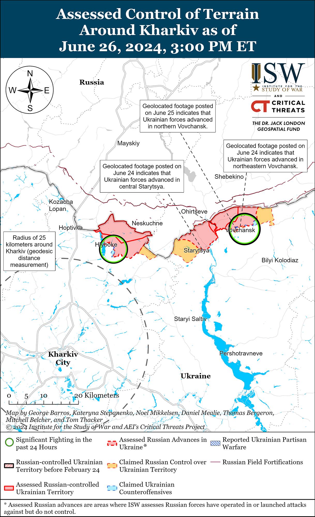 26 июня бои на севере Харьковской области продолжались, но подтвержденных изменений на линии фронта не было. Спикер Харьковской группы войск полковник Юрий Повх и глава Харьковской области Украины Олег Синегубов отметили, что украинские силы продолжают «блокировать» небольшую группировку российских войск на Волчанском агрегатном заводе на фоне продолжающихся сообщений об ожесточенных ближних боях в районе Волчанска (северо-восток Харькова). [42] 25 и 26 июня российские и украинские войска сообщали о боях в районах Волчанска и его окрестностей, к востоку от Волчанска в районе Тихого и Глубокого (к северу от Харькова). [43] В украинском Генштабе отметили, что во второй половине дня 26 июня российские войска выпустили 11 управляемых планирующих бомб по населенным пунктам Липцы (к северу от Харькова). [44]