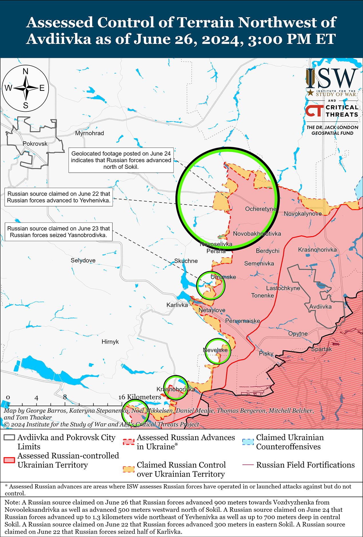 Российские войска в последнее время не добились каких-либо подтвержденных успехов к западу от Авдеевки на фоне продолжающихся боев в этом районе 26 июня. Российские военные блогеры утверждали, что российские войска продвинулись на 900 метров от Новоалександровки в сторону Воздвиженки (оба к северо-западу от Авдеевки); 500 метров севернее Сокола (северо-западнее Авдеевки); и по обе стороны Карловского водохранилища (юго-западнее Авдеевки), но ISW не обнаружил подтверждения этим заявлениям. [62] Также продолжались атаки к северо-западу от Авдеевки вблизи Прогресса, Евгеновки и Новоселовки Первой; западнее Авдеевки в районе Яснобродовки; и юго-западнее Авдеевки вблизи и Карловки 25 и 26 июня. [63] Пресс-секретарь украинской бригады, действующей на Авдеевском направлении, заявил, что российские войска ведут атаки пехоты численностью до отделения, и что эти подразделения оснащены средствами радиоэлектронной борьбы (РЭБ), которые ограничивают действия украинских беспилотников. [64] В районе Карловки ведут бои подразделения российского батальона «Сомали» (1-й АК ДНР), а на Авдеевском направлении, по имеющимся данным, ведут бои подразделения российского спецназа «Вега» (по имеющимся данным, 24-й гвардейской бригады спецназа). [65]