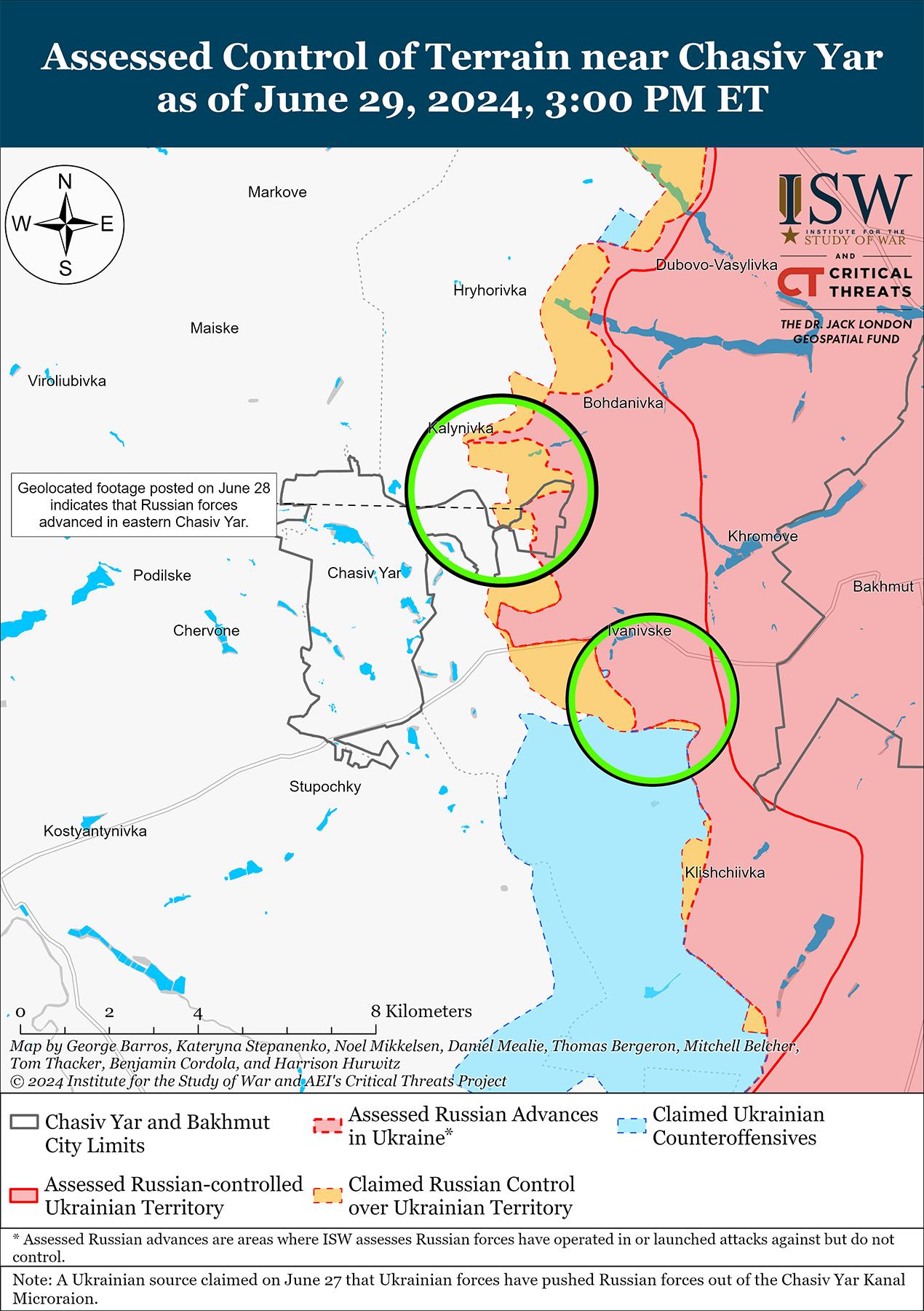 Российские войска недавно продвинулись в районе Часового Яра на фоне продолжающихся российских наступательных операций в этом районе 29 июня. Геолоцированные кадры, опубликованные 29 июня, показывают, что российские войска незначительно продвинулись в пределах микрорайона Канал (самый восточный Часов Яр). [29] Российские военные блогеры утверждали, что российские войска продвинулись в лесном массиве к югу от Калиновки (к северу от Часового Яра). [30] 29 июня бои продолжались в районе Часового Яра, Калиновки и Клещеевки (юго-восточнее Часового Яра). [31] Сообщается, что подразделения российской 98-й дивизии ВДВ продолжают действовать в районе Часового Яра. [32]