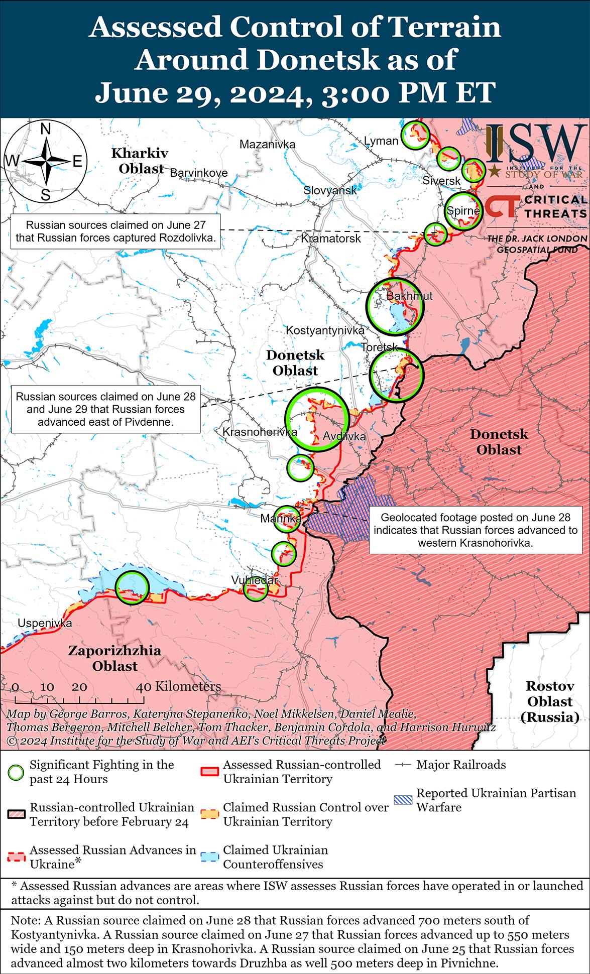 Российские войска недавно продвинулись к западу и юго-западу от Донецка на фоне продолжающихся российских наступательных операций в этом районе 29 июня. Геолоцированные кадры, опубликованные 28 июня, свидетельствуют о том, что российские войска недавно продвинулись в юго-западной части Красногоровки (к западу от Донецка). [42] Опубликованные 29 июня дополнительные геолоцированные кадры, на которых видно, как украинские войска отбивают российскую механизированную атаку численностью примерно до взвода, свидетельствуют о том, что российские войска недавно продвинулись к юго-востоку от Константиновки (юго-запад Донецка). [43] 28 июня представитель украинской бригады заявил, что украинские силы недавно отразили усиленный российский механизированный штурм численностью до роты на неустановленном участке на Кураховском направлении (к западу и юго-западу от Донецка). [44] Пресс-секретарь бригады заявил, что российские войска использовали в наступлении девять танков и девять бронемашин, что украинские военные уничтожили один танк и повредили еще четыре, в том числе несколько танков Т-90. Российские источники утверждали, что российские войска продвинулись в восточной части Максимильяновки (к западу от Донецка). [45] 29 июня бои продолжались к западу от Донецка в районе Красногоровки и к юго-западу от Донецка в районах населенных пунктов Победа, Парасковиевка, Константиновка и Водяное. [46] Сообщается, что подразделения российской 238-й артиллерийской бригады (8-я общевойсковая армия, Южный военный округ) продолжают действовать в районе Максимильяновки. [47]
