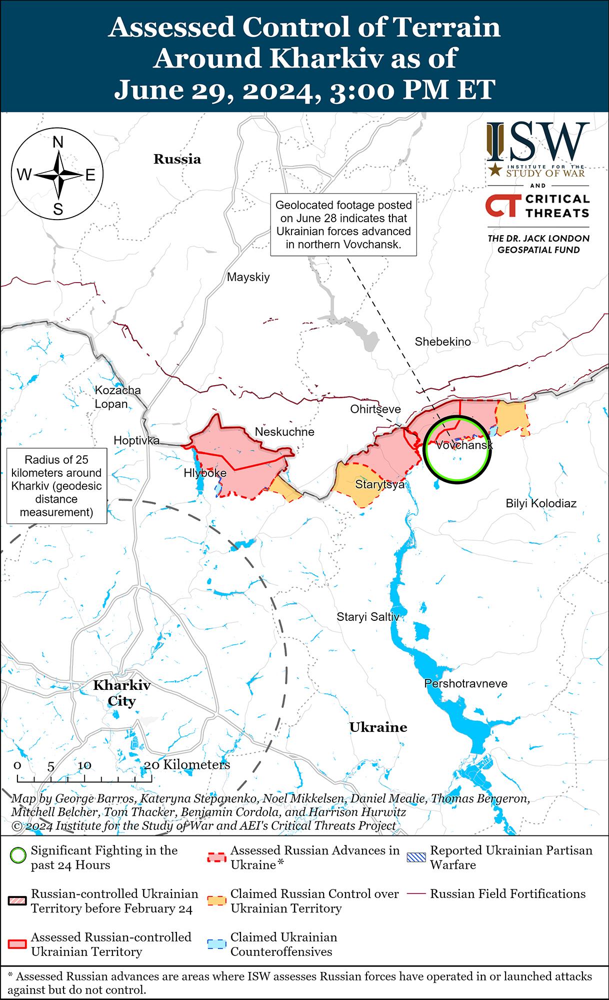29 июня бои продолжались к северу и северо-востоку от Харькова, однако подтвержденных изменений линии фронта на этом участке не было. 28 и 29 июня бои продолжались в районах населенных пунктов Волчанск (северо-восток Харькова) и Глубокое (севернее Харькова). [14] Российские военные блогеры утверждали, что российские войска наносят удары термобарической артиллерией ТОС-1А на Липцынском направлении (к северу от Харькова) и что российские войска уничтожили неустановленную переправу через реку Волчья в Волчанске. [15] Официальный представитель украинской Хортицкой группировки войск подполковник Назар Волошин заявил, что некоторые российские военные, действующие на Волчанском направлении, в частности бойцы 153-го танкового полка (47-я танковая дивизия, 1-я гвардейская танковая армия, Московский военный округ), отказываются воевать. [16] Сообщается, что подразделения российской 83-й воздушно-десантной бригады (ВДВ) действуют на территории Волчанского агрегатного завода. [17] Недавно 16 и 23 июня украинские официальные лица сообщили, что российские войска предприняли попытку вывести подразделения 83-й бригады ВДВ, которые стали небоеспособными из-за больших потерь на Харьковском направлении. [18]
