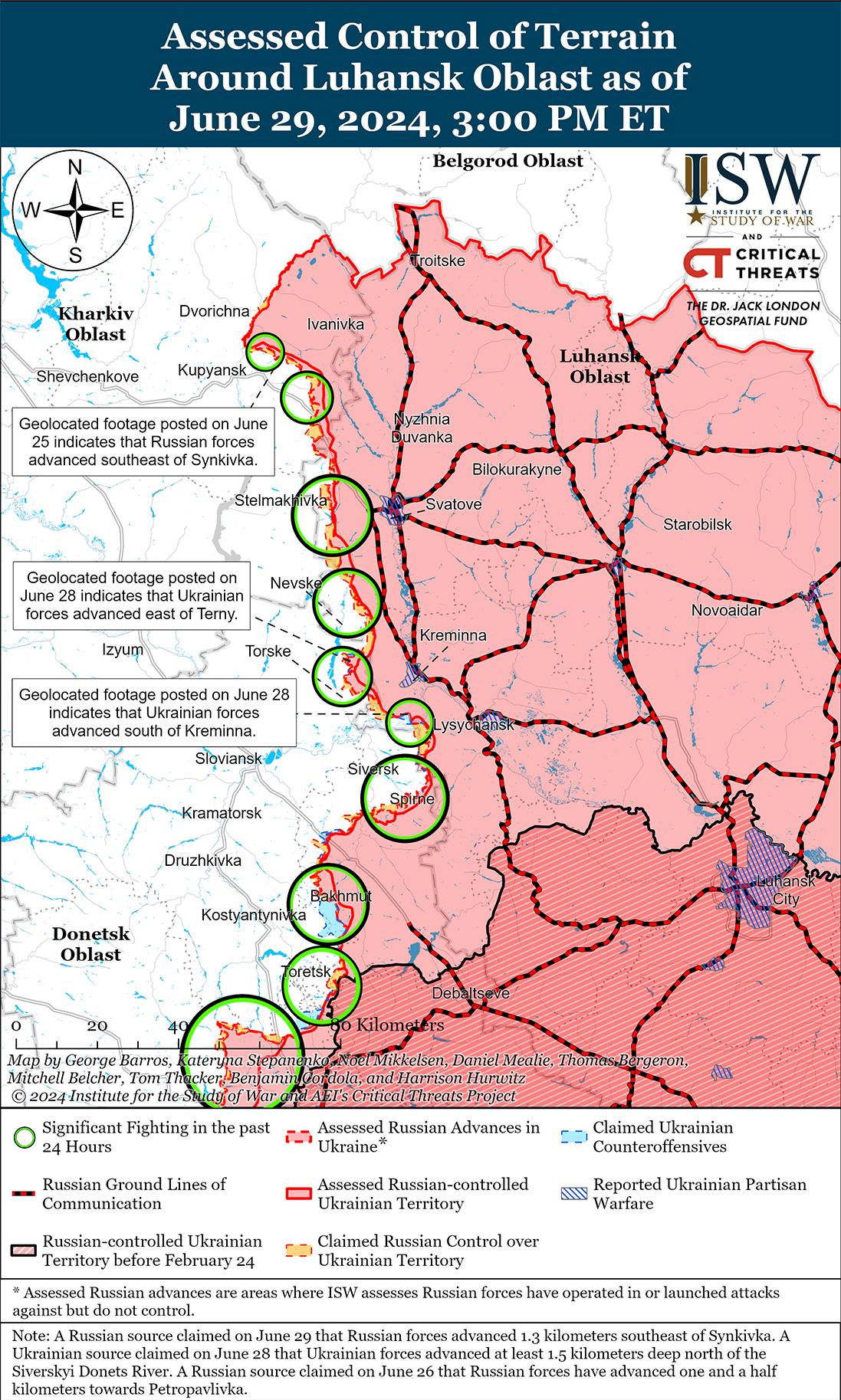 Российские войска недавно незначительно продвинулись к юго-востоку от Купянска, а украинские силы недавно продвинулись в районе Кременной на фоне продолжающихся боев на линии Купянск-Сватово-Кременная 28 и 29 июня. Геолоцированные кадры, опубликованные 29 июня, свидетельствуют о том, что российские войска недавно продвинулись вдоль железнодорожной линии к югу от Ивановки (юго-восточнее Купянска). [19] На дополнительных геолоцированных кадрах, опубликованных 28 и 29 июня, видно, что украинские войска недавно продвинулись к востоку от Терны (к западу от Кременной) и в лесном массиве к юго-западу от Кременной. [20] Российский военный блогер утверждал, что российские войска продвинулись примерно на километр вглубь к юго-востоку от Синьковки (северо-восток Купянска) и захватили позиции к северу от Петропавловки (восточнее Купянска). [21] Другой российский блогер утверждал, что российские войска вытеснили украинские войска из лесных массивов к востоку от Мясожаровки (к западу от Сватово) и продвинулись к административным границам населенного пункта. [22] Российские военные блогеры также утверждали, что российские войска продвинулись в районе Невского (юго-западнее Сватово). [23] Украинский военнослужащий, действующий на Лиманском направлении, сообщил, что российские войска используют беспилотники для сброса химических боеприпасов, зажигательных веществ, газов и отравляющих веществ на украинские позиции на этом направлении. [24] Враг продолжал штурмовые действия юго-восточнее Купянска в районах населенных пунктов Степная, Новоселовка, Стельмаховка и Кругляковка; юго-западнее Сватово в районе Макеевки и Грековки; западнее Кременной в районе Торского; и юго-западнее Кременной в районе Серебрянского лесничества 28 и 29 июня. [25]