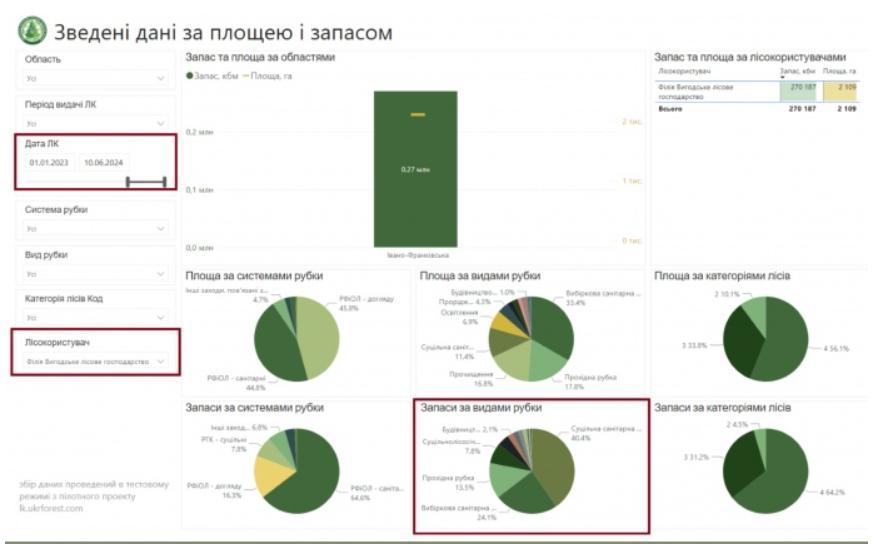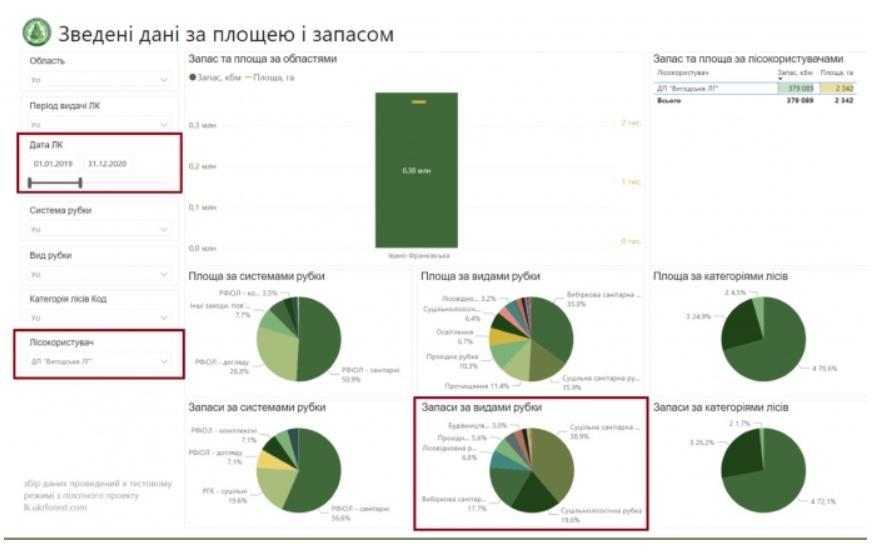 Гляньмо на відкриті дані щодо заготівлі деревини Вигодським лісгоспом. Один із параметрів – скільки деревини і на якій площі заготовлено різними видами рубок.