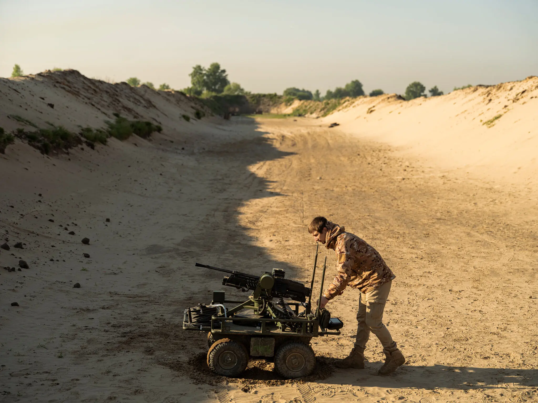 Українська компанія Roboneers розробила автоматизовану зброю із гарматною туреллю, встановлену на наземному безпілотнику. Кредит…Саша Маслов для The New York Times