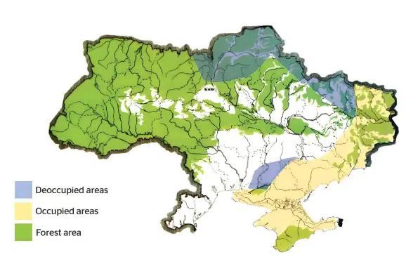 В июле компания Forest Europe нанесла на карту зоны боевых действий над обширными лесами Украины. (Фото Credit: Forest Europe) /Очень похоже на карту, реконструирующую лесистость нынешней территории Украины, до начала её освоения человеком. М.П./