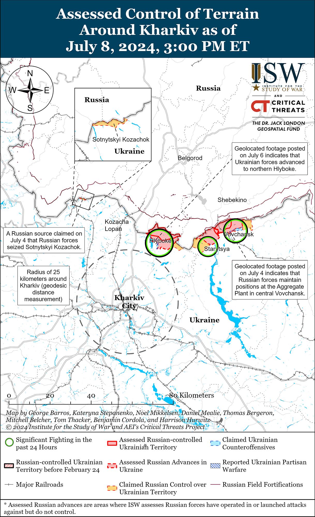 8 июля враг продолжил наступательные действия на севере Харьковской области, но не добился подтвержденных успехов. Российские военные блогеры заявили, что украинские силы ведут постоянные контратаки в районе Глубокого (к северу от Харькова) и что тяжелые бои продолжаются в городских районах Волчанска (к северо-востоку от Харькова). [32] Генштаб Вооруженных сил Украины сообщил о наземных атаках противника к северу от Харькова в районе Глубокого и Липцев и к северо-востоку от Харькова в районе Старицы, Тихого и Волчанска 8 июля. [33]