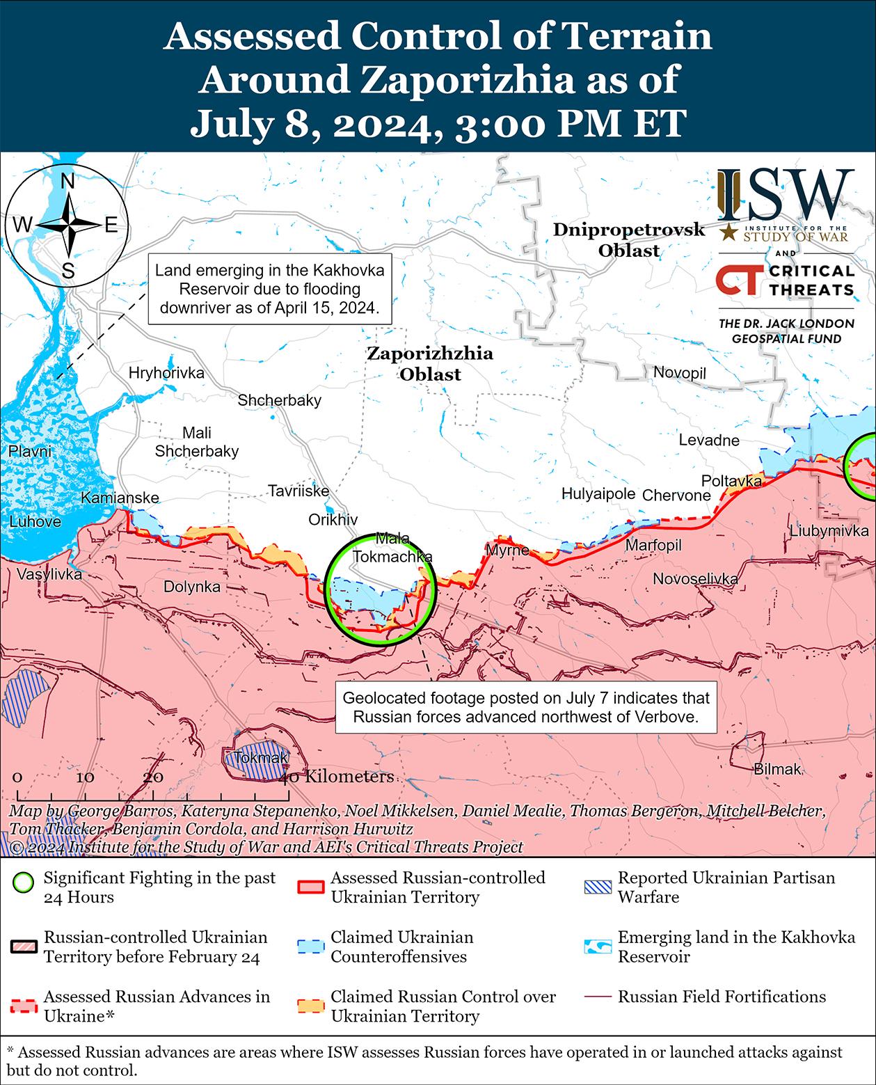 Российские войска недавно продвинулись на западе Запорожской области на фоне продолжающихся позиционных боев в этом районе 8 июля. Геолоцированные кадры, опубликованные 7 июля, свидетельствуют о том, что российские войска продвинулись к северо-западу от Вербовое (к востоку от Работино). [52] Российский военный блогер утверждал, что российские войска продвинулись в том же районе к северо-западу от Вербового[53] Позиционные бои продолжались в районе Работино и Малой Токмачки (северо-восточнее Работино) 7 и 8 июля. [54] Сообщается, что на Запорожском направлении действуют подразделения 291-го мотострелкового полка (42-я мотострелковая дивизия, 58-я общевойсковая армия, Южный военный округ); сообщается, что части 11-й армии ВВС и ПВО (ВКС России и Восточный военный округ [ВВО]) нанесли удары планирующими бомбами в районе Новоселовки (юго-западнее Гуляйполя); сообщается, что подразделения 64-й мотострелковой бригады (35-я ОА, ВВО) действуют в районе населенного пункта Марфополь (юго-восточнее Гуляйполя); и подразделения российского 247-го парашютно-десантного полка (7-й дивизии ВДВ), как сообщается, действуют в районе Новопокровки (северо-восточнее Работино). [55]