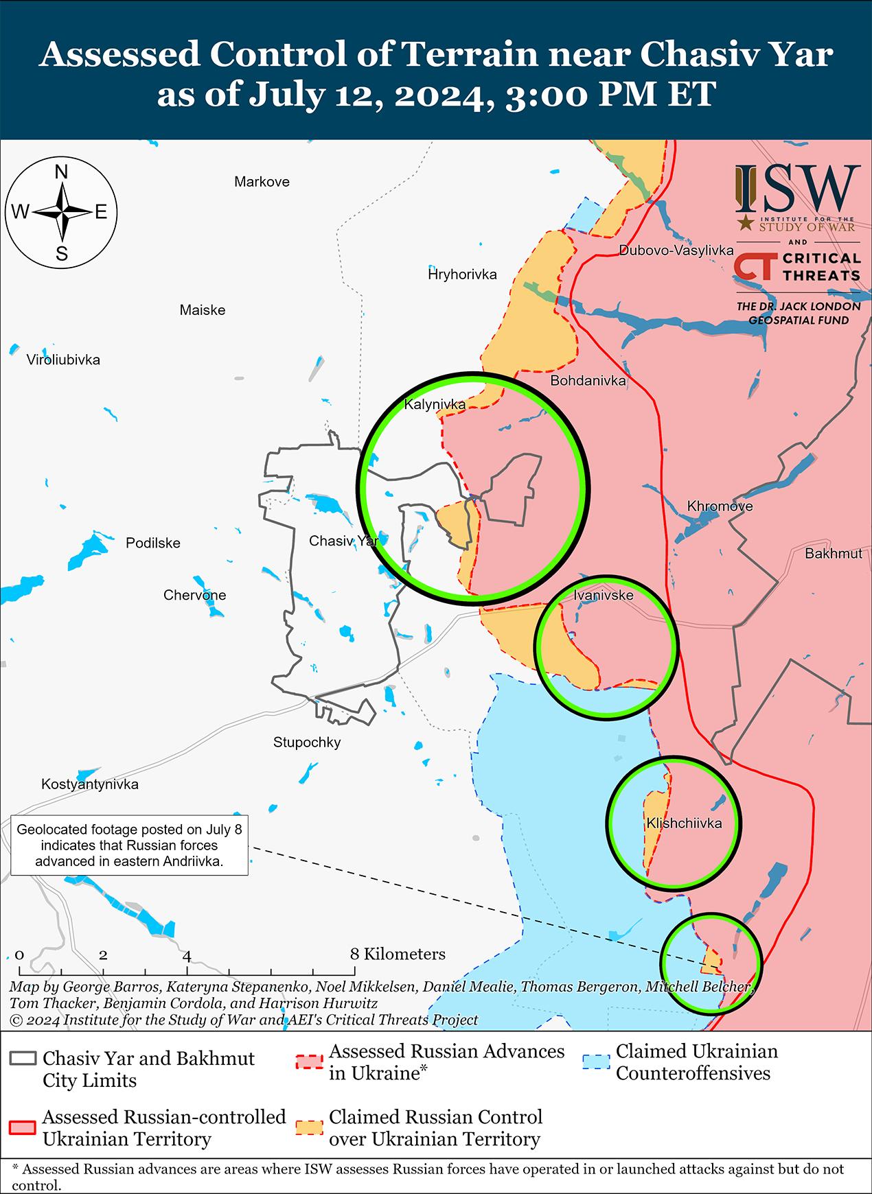 На фоне продолжающихся наступательных действий в районе Часового Яра 12 июля российские войска не добились подтвержденных успехов. 11 и 12 июля враг продолжил обстрелы в районе Часового Яра, к востоку от Часового Яра в районе Ивановского и к юго-востоку от Часового Яра в районе Клещеевки и Андреевки. [45] 12 июля пресс-секретарь украинской Хортицкой группировки войск полковник Назар Волошин сообщил, что российские войска в значительной степени сместили акцент с Часового Яра на Торецкое направление. [46] Российские источники утверждали, что российские войска нанесли удар по украинскому складу боеприпасов в районе Константиновки (юго-западнее Часового Яра и к северу от Донецка). [47]