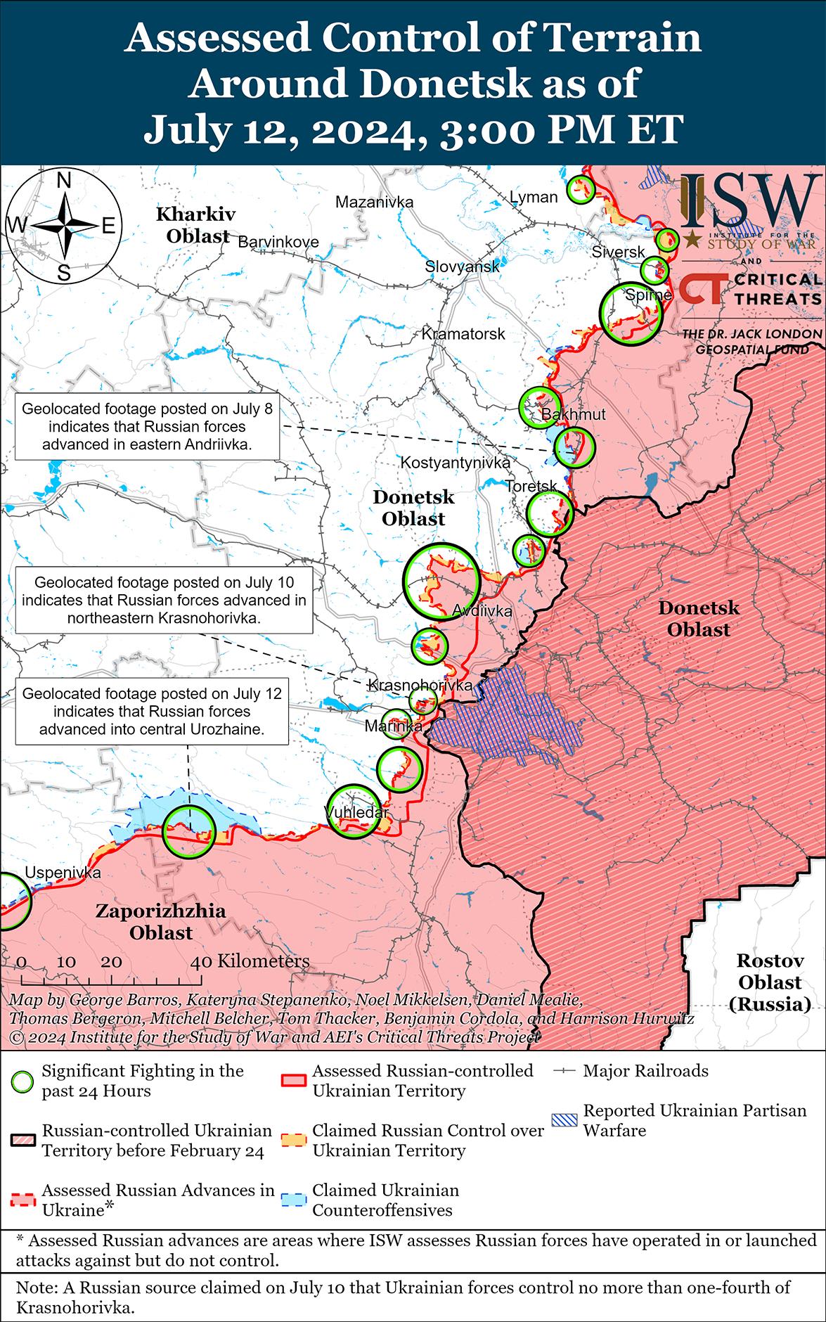 Недавно российские войска продвинулись к северо-западу от Авдеевки. На геолоцированных кадрах, опубликованных 12 июля, видно, что российские войска продвинулись к северо-восточным окраинам Новоселовки Первой (северо-западнее Авдеевки). [50] Российские военные блогеры также утверждали, что российские войска продвинулись на северо-восток Новоселовки Первой и закрепились в населенном пункте, хотя ISW не обнаружил визуальных подтверждений того, что российские войска продвинулись так сильно, как утверждают военблогеры. [51] Украинский военный обозреватель Константин Машовец заявил, что подразделения российских 55-й и 74-й мотострелковых бригад (обе входят в состав 41-й общевойсковой армии, Центрального военного округа [ЦВО]) и 114-й мотострелковой бригады (1-й армейский корпус Донецкой Народной Республики [ДНР]) сосредотачиваются на наступлении на Новоселовку Первую с севера, северо-востока и юго-востока, поскольку южная Новоселовка Первая является последней тактически значимой украинской оборонительной позицией на восточной стороне река Волчья. [52] Кроме того, 11 и 12 июля российские войска продолжали обстрелы северо-западнее Авдеевки в районах Новоалександровки, Воздвиженки, Прогресса, Сокола и Калиново и к западу от Авдеевки в районе Карловки и Яснобродовки. [53] Машовец заявил, что подразделения российской 30-й мотострелковой бригады (2-я ОА) и 35-й мотострелковой бригады (41-я ОА) ведут бои в районе Лозувацкого (северо-западнее Авдеевки) и в направлении Воздвиженки; подразделения 433-го мотострелкового полка (27-я мотострелковая дивизия, 2-я ОА) при поддержке подразделений 15-й мотострелковой бригады (2-я ОА) и 55-й мотострелковой бригады ведут бои вдоль железной дороги в направлении Прогресса; а подразделения 30-й и 35-й мотострелковых бригад ведут бои по линии Тимофеевка-Прогрес (северо-западнее Авдеевки). [54]