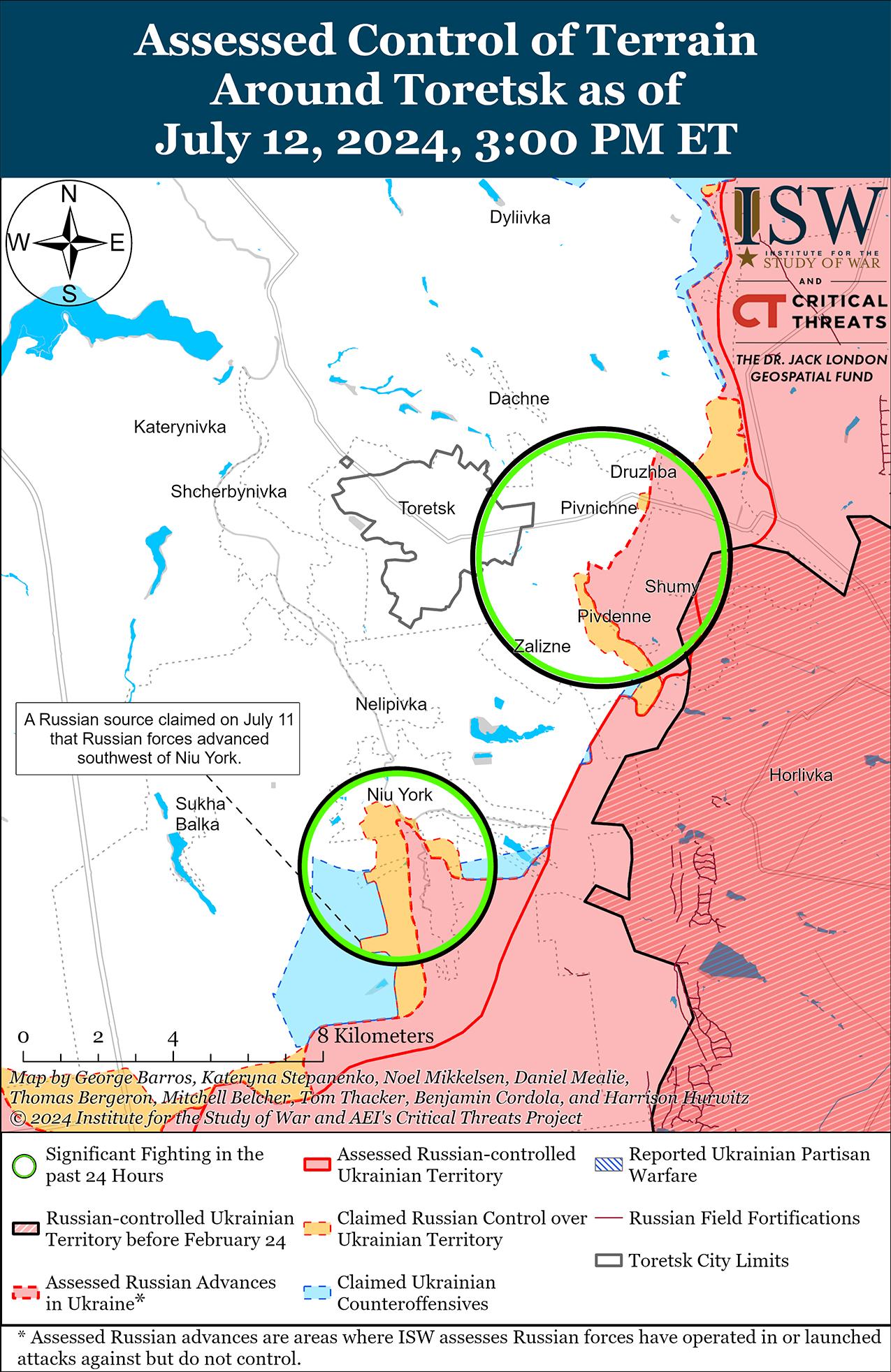 По оценкам западных и американских официальных лиц, украинские силы продолжат обороняться в течение следующих шести месяцев и не смогут провести широкомасштабную контрнаступательную операцию до 2025 года. Тем не менее, украинские силы уже пытаются оспорить тактическую инициативу в ограниченных контратаках на отдельных участках фронта, и украинские силы могут быть в состоянии проводить ограниченные контрнаступательные операции, даже находясь в основном в обороне, в зависимости от прибытия западной помощи. Газета The New York Times (NYT) сообщила 11 июля, что высокопоставленный чиновник НАТО заявил, что Украине придется подождать дополнительной помощи Запада в области безопасности и развернуть больше своих сил на линии фронта, прежде чем проводить контрнаступательные операции, и что Украина, вероятно, не сможет проводить эти операции до 2025 года. [1] Высокопоставленный представитель министерства обороны США заявил, что украинские силы будут оставаться в обороне в течение следующих шести месяцев (до января 2025 года), и что российские войска вряд ли смогут продвинуться на значительные территории в течение этого времени. [2] ISW по-прежнему считает, что российские войска в настоящее время вряд ли достигнут оперативно значимых успехов в Украине, а сформулированная президентом России Владимиром Путиным теория победы направлена на то, чтобы российские войска совершали последовательные постепенные ползучие наступления вместо того, чтобы проводить быстрые оперативно значимые маневры. [3]