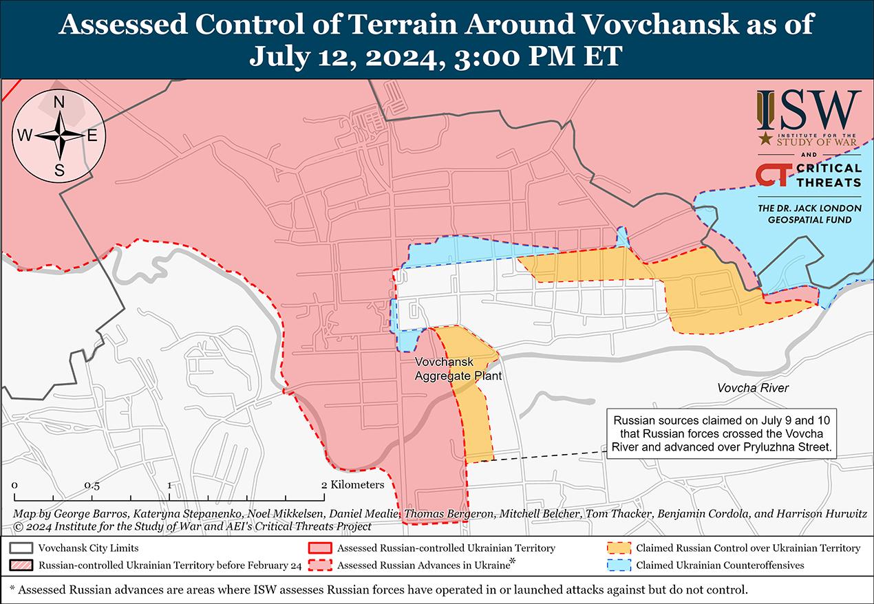 12 июля бои продолжались к северу и северо-востоку от Харькова, но подтвержденных изменений на линии фронта не было. Российский блогер продолжает утверждать, что российские войска удерживают прочные позиции на южном берегу реки Волчья в центре Волчанска (к северо-востоку от Харькова), а ISW до сих пор не обнаружил доказательств, опровергающих опубликованные 7 июля геолоцированные кадры, свидетельствующие о том, что российские войска пересекли реку Волчья в центре Волчанска. [37] Российский блогер утверждал, что небольшие украинские штурмовые группы регулярно заходят в северное Глубокое (к северу от Харькова), но российские подразделения беспилотников и артиллерии отбивают эти украинские группы. [38] Генштаб Вооруженных сил Украины сообщил, что 12 июля российские войска продолжали наступательные действия в районах населенных пунктов Глубокое, Волчанск и Старица (северо-восточнее Харькова). [39] Пресс-секретарь украинской бригады, действующей на севере Харьковской области, заявил, что в составе российских штурмовых групп в этом районе воюют добровольцы из стран Африки и бывшего Советского Союза. [40]