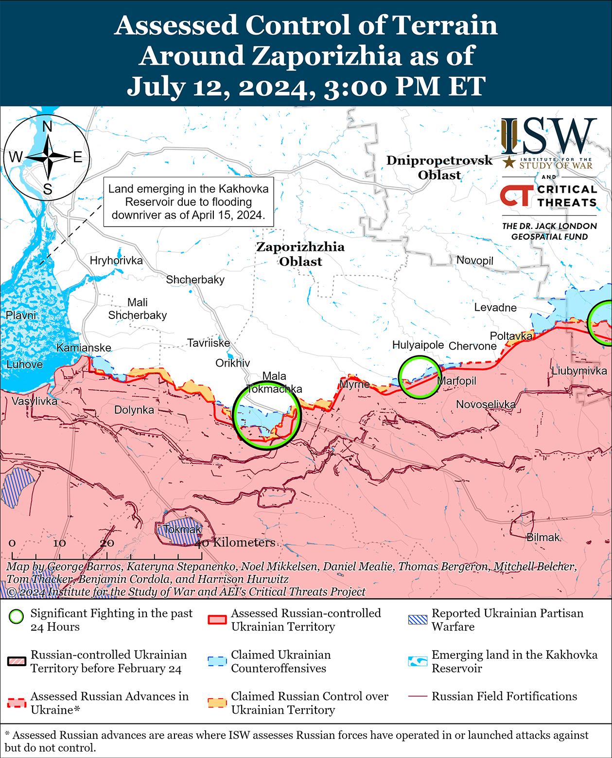 Недавно российские войска продвинулись к югу от Великой Новоселки в районе границы Донецкой и Запорожской областей. На геолоцированных кадрах, опубликованных 12 июля, видно, как подразделения российской 37-й мотострелковой бригады (36-я ОА, Восточный военный округ [ВВО]) поднимают флаг в центре Урожайного (к югу от Великой Новоселки), хотя российские военные блогеры отметили, что российские войска продвинулись в центральную часть Урожайного, но не захватили весь населенный пункт. [59] Российские военные блогеры утверждали, что за Урожайный также воюют подразделения российской 5-й танковой бригады (36-й ОА) и 14-й бригады спецназа (Главное управление разведки Генштаба ВС РФ). [60] Украинский генеральный штаб сообщил, что российские войска также провели ограниченные атаки к югу от Гуляйполя 11 и 12 июля.[61]