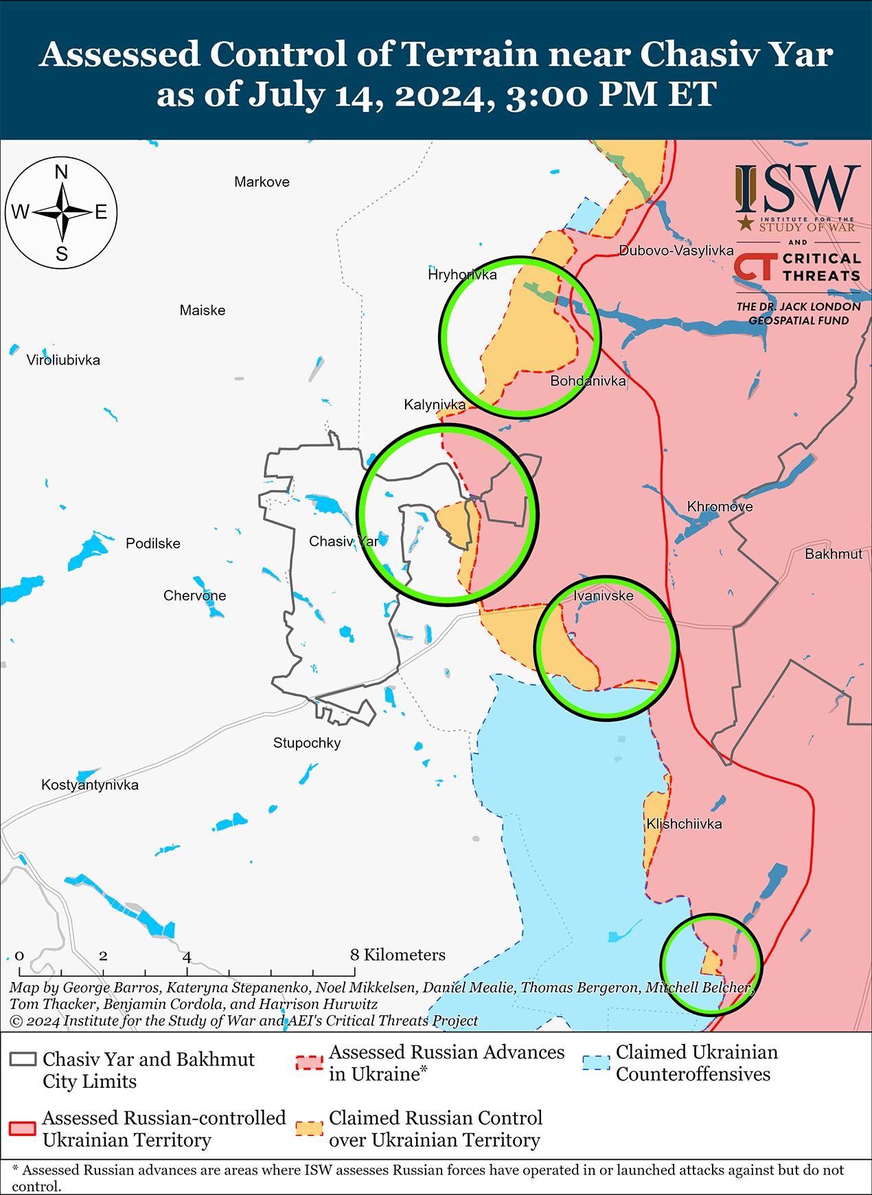 14 июля российские войска продолжили наступательные действия в районе Часового Яра, но подтвержденных изменений на линии фронта не было. Командир украинского батальона, действующий в районе Часового Яра, сообщил, что российские войска не ведут крупных штурмовых действий силами пехоты, а вместо этого действуют небольшими пехотными группами при поддержке артиллерии и беспилотников на направлении Часов Яр. [32] Командир батальона также заявил, что российские войска используют в этом районе большое количество беспилотных летательных аппаратов. Продолжались бои под Часовым Яром; к северу от Часового Яра в районе Григорьевки; восточнее Часового Яра в районе Ивановского; и юго-восточнее Часового Яра в районе Клещеевки и Андреевки 13 и 14 июля. [33] Сообщается, что подразделения российской 98-й воздушно-десантной дивизии (ВДВ) продолжают действовать в районе Часового Яра. [34]
