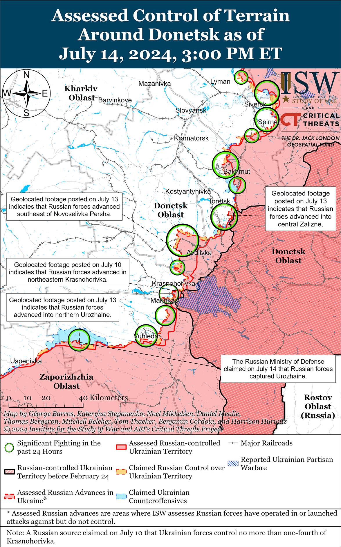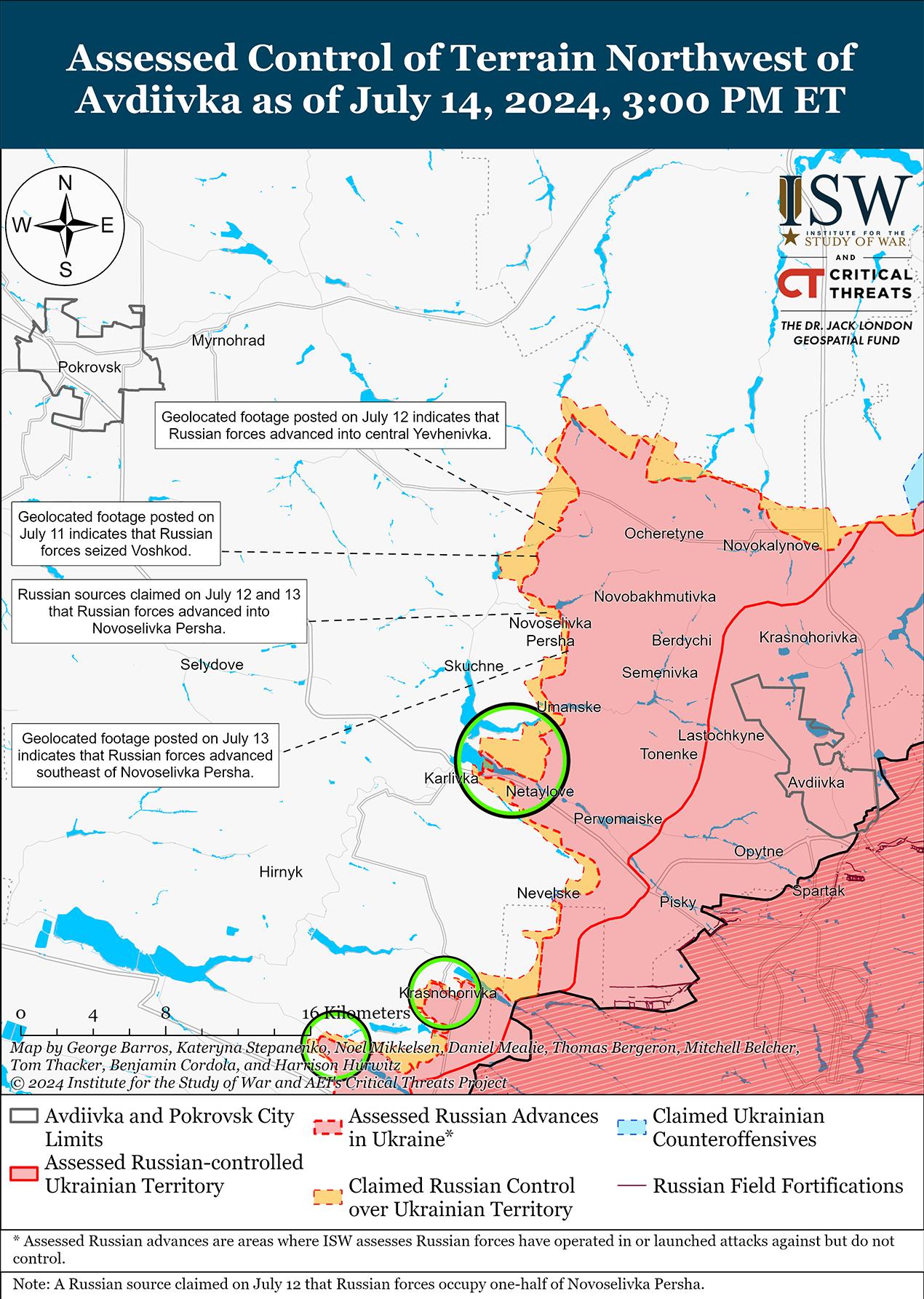 Российские войска недавно продвинулись к северо-западу от Авдеевки на фоне продолжающихся российских наступательных операций в этом районе. Геолоцированные кадры, опубликованные 14 июля, показывают, что российские войска недавно продвинулись к северу от Сокола (к северо-западу от Авдеевки) и к северу от Новоселовки Первой (к северо-западу от Авдеевки). [38] Российский блогер утверждал, что российские войска продвигаются к северу и югу от Яснобродовки (к западу от Авдеевки), хотя ISW не обнаружил визуальных подтверждений этих заявлений. [39] 13 и 14 июля бои продолжались к северо-западу от Авдеевки в районах населенных пунктов Прогресс, Воздвиженка, Новоалександровка, Очеретино, Калиново, Лозувацкое и Новоселовка Первая, а также западнее Авдеевки в районе Яснобродовки и Карловки. [40]