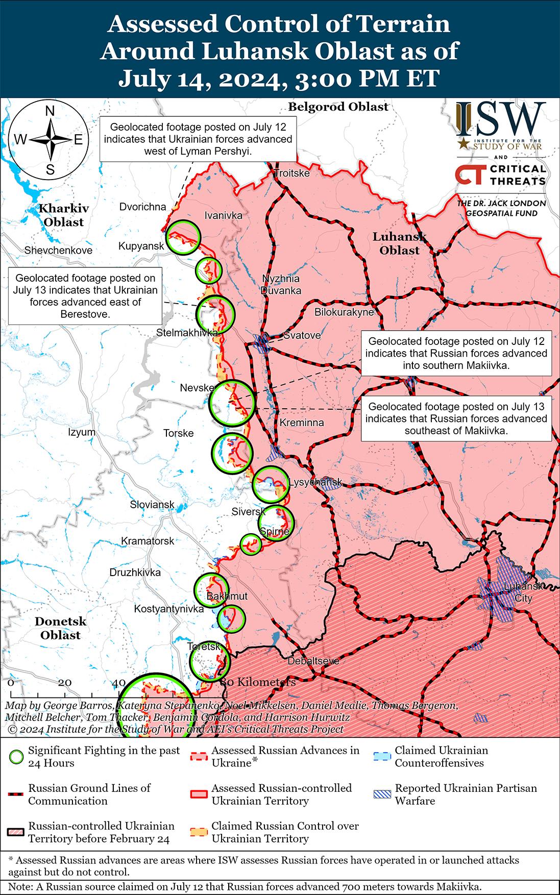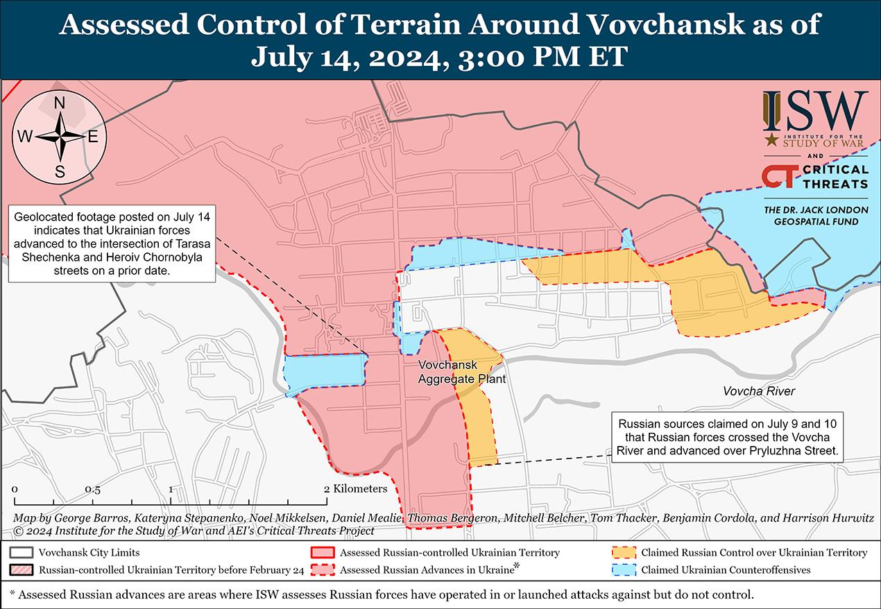 13 и 14 июля украинские силы провели локальные контратаки к северу и северо-востоку от Харькова и недавно восстановили отдельные позиции в Волчанске (к северо-востоку от Харькова). [18] На геолоцированных кадрах, опубликованных 14 июля, видно, как части чеченского 204-го полка спецназа «Ахмат» наносят удары по украинским силам на северо-западе Волчанска, что свидетельствует о том, что украинские силы вернули себе некоторые позиции в этом районе. [19] Украинский источник сообщил, что украинские силы отбросили российские войска, а именно подразделения 245-го мотострелкового полка (47-я танковая дивизия, 1-я гвардейская танковая армия, Московский военный округ), от Сотницкого Казачка (северо-западнее Харькова). [20] В настоящее время ISW не может подтвердить это сообщение. Бои продолжались в районах Волчанска и Глубокого (севернее Харькова). [21] Национальная гвардия Украины сообщила, что в последнее время количество наземных атак российской пехоты в районе Липцов (к северу от Харькова) сократилось, однако российские войска активизировали авиаудары в этом районе. [22]