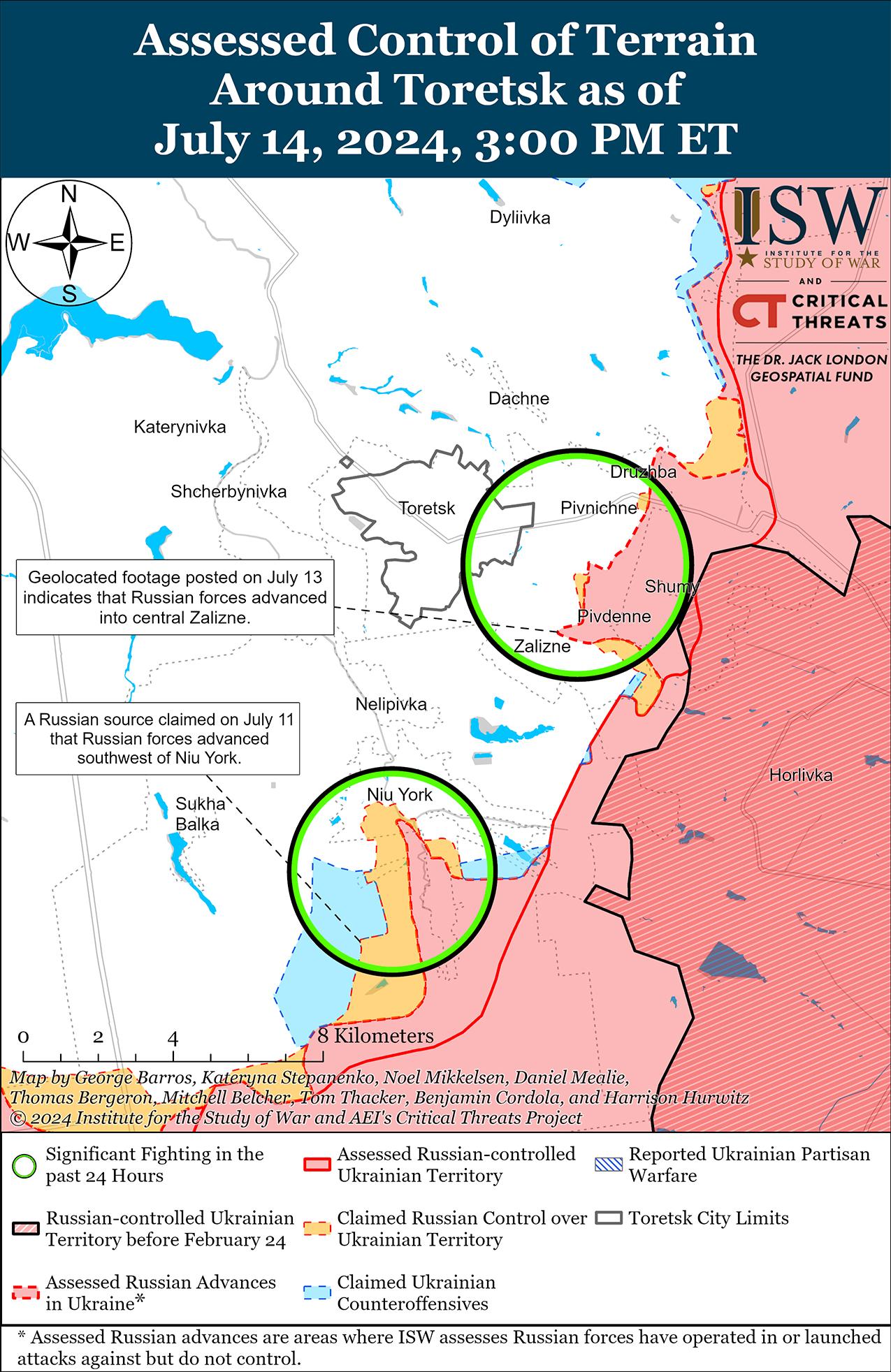 14 июля враг продолжил наступательные действия на Торецком направлении, однако подтвержденных изменений на линии фронта не было. Российский военный блогер заявил, что российские войска продвинулись к юго-западу от Нью-Йорка (к югу от Торецка) и в районе Железного (к юго-востоку от Торецка), хотя ISW не обнаружил визуальных доказательств этого заявления. [35] Бои продолжались восточнее Торецка в районе Дружбы; юго-восточнее Торецка в районе Железного, Северного и Южного; и к югу от Торецка возле Нью-Йорка. [36] Сообщается, что подразделения российской 9-й мотострелковой бригады (1-й АК ДНР) продолжают действовать в районе Нью-Йорка. [37]