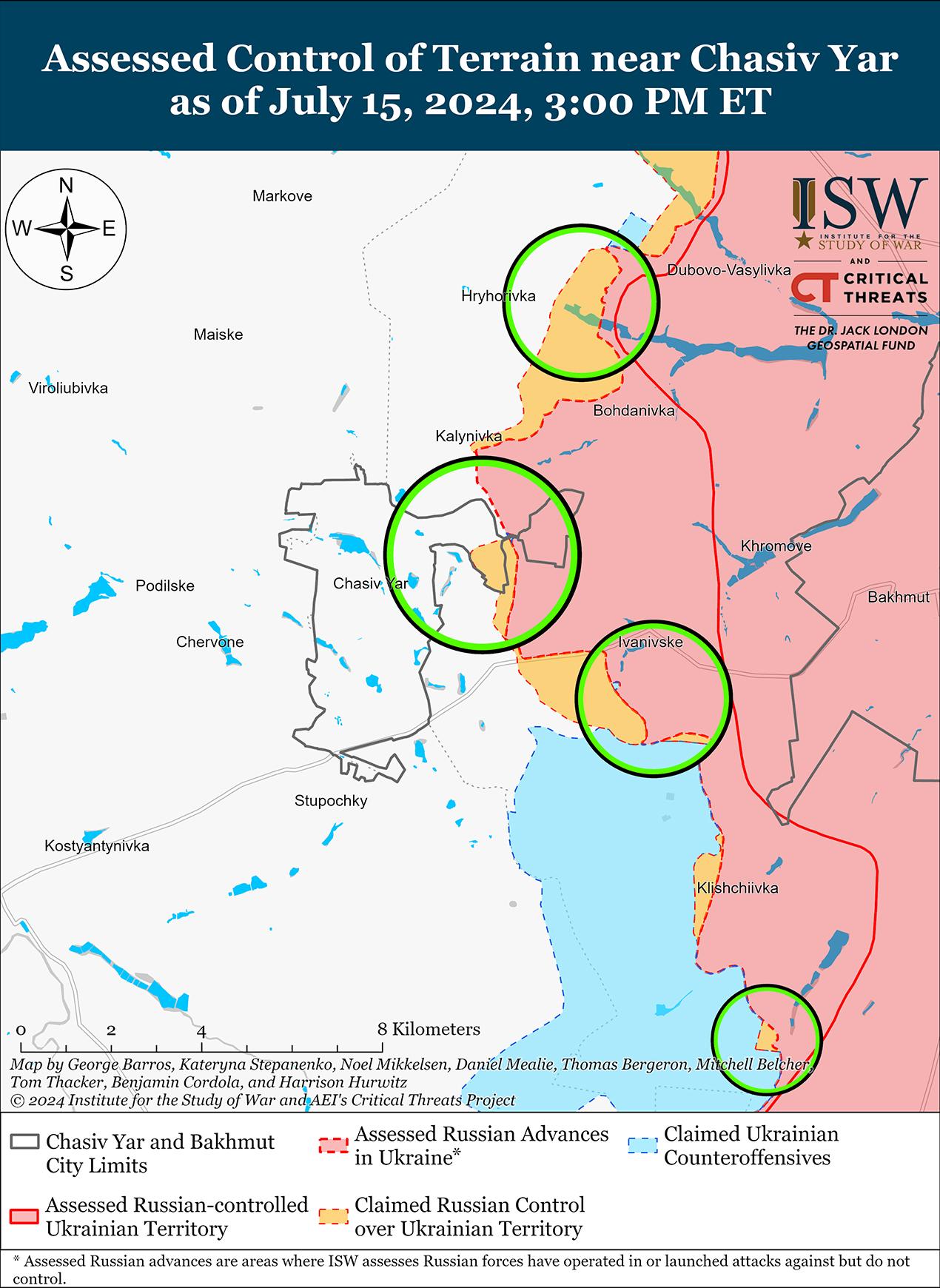 Российские войска не добились каких-либо подтвержденных успехов на фоне продолжающихся боев в районе Часового Яра 15 июля. Российские войска перешли в наступление в самом восточном районе Часового Яра; к северу от Часового Яра в районе Григорьевки и Калиновки; восточнее Часового Яра в районе Ивановского; и юго-восточнее Часового Яра в районе Андреевки 14 и 15 июля. [36] Сообщается, что подразделения российской 98-й воздушно-десантной дивизии (ВДВ) продолжают действовать в районе Часового Яра. [37]