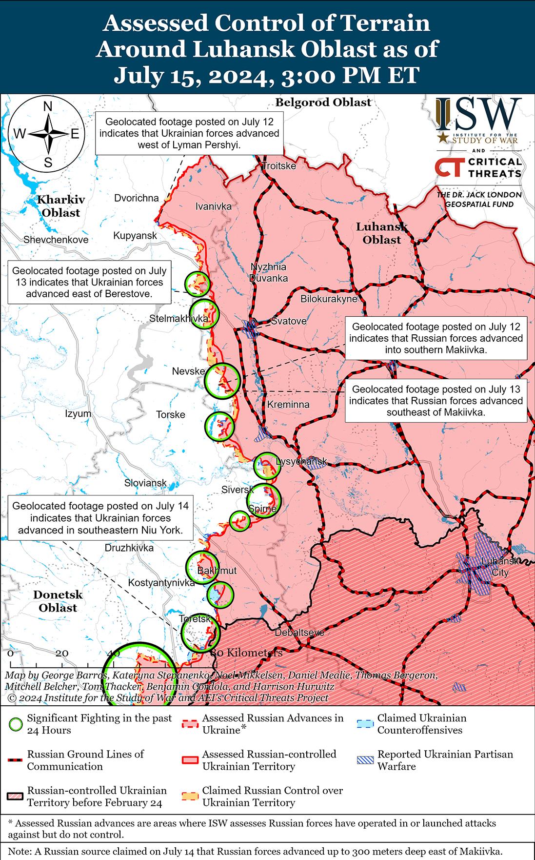 Как российские, так и украинские силы недавно продвинулись на Торецком направлении, бои продолжались 15 июля. Геолоцированные кадры, опубликованные 14 июля, показывают, что украинские силы недавно отбили некоторые позиции на юге Нью-Йорка (к югу от Торецка), и подтверждают некоторые заявления о продвижении российских войск в городе. [38] На дополнительных геолоцированных кадрах, опубликованных 15 июля, видно, что российские войска в последнее время незначительно продвинулись в восточной части Северного (к востоку от Торецка). [39] 14 и 15 июля российские войска также продолжали наступление в районе Железного (юго-восточнее Торецка), где, по утверждениям российских военных, российские войска продвинулись вперед. [40] Однако ISW не обнаружил подтверждения этих заявленных российских успехов в Железном.