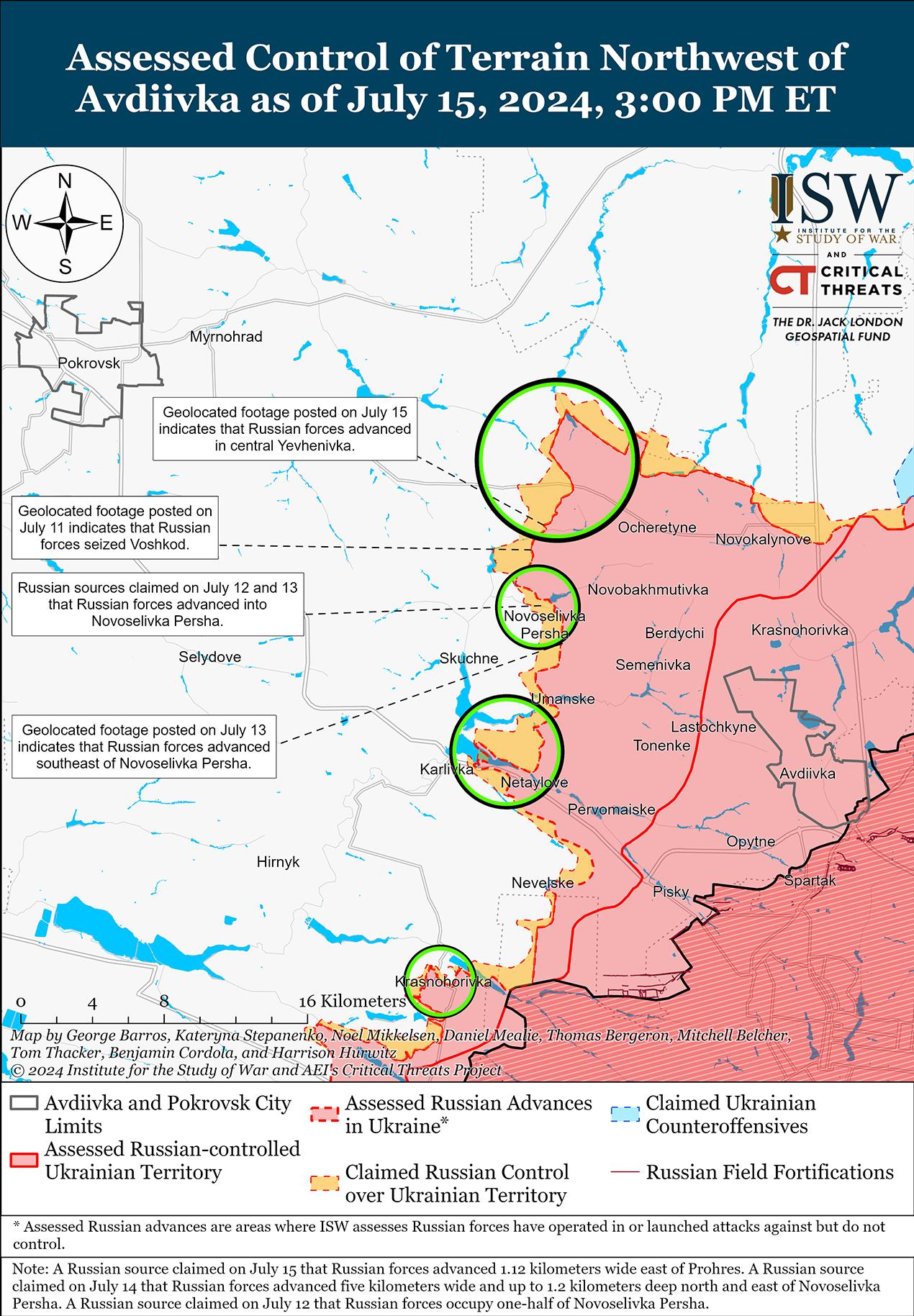 Российские войска недавно продвинулись к северо-западу от Авдеевки на фоне продолжающихся боев 15 июля. На геолоцированных кадрах, опубликованных 15 июля, видно, что российские войска продвинулись в центральной части Евгеновки (северо-западнее Авдеевки). [41] Российские военные утверждали, что российские войска также продвинулись на 1,12 км вглубь вдоль железнодорожной линии к востоку от Прогресса (к северо-западу от Авдеевки), до 1,2 км в глубину полей к юго-востоку от Новоселовки Первой (северо-запад Авдеевки) и немного на окраинах Карловки (юго-запад Авдеевки), однако ISW не обнаружил подтверждения этим заявлениям. [42] Враг также атаковал северо-западнее Авдеевки вблизи Новоалександровки, Воздвиженки и Лозуватского; и западнее Авдеевки в районе Яснобродовки 14 и 15 июля. [43] Сообщается, что на Авдеевском направлении действуют подразделения 1-й мотострелковой бригады (1-й АК ДНР). [44]