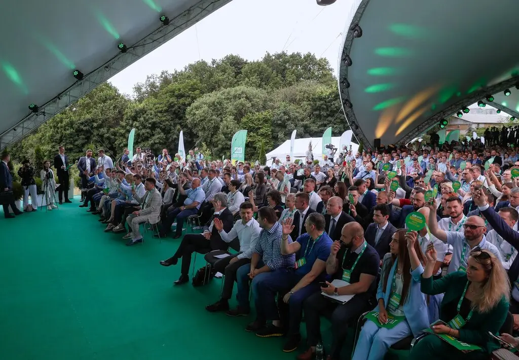 З’їзд партії Зеленського «Слуга народу» у 2019 році. Партія, як і раніше, має номінальну парламентську більшість у 235 місць. Фото…Сергій Долженко/EPA, via Shutterstock