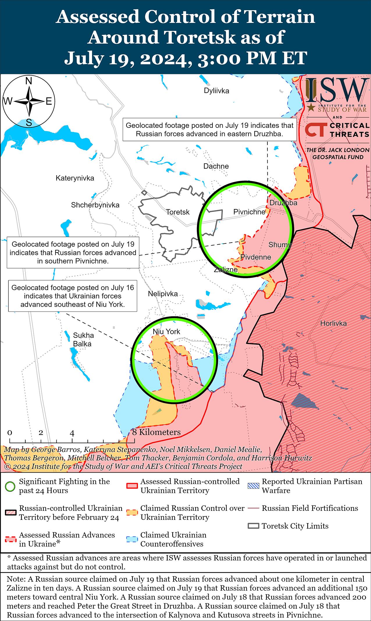 Российские войска недавно продвинулись к востоку от Торецка на фоне продолжающихся российских наступательных операций в этом районе 19 июля. Геолоцированные кадры, опубликованные 19 июля, свидетельствуют о том, что российские войска недавно продвинулись на запад вдоль улицы Петра Великого в восточной части Дружбы (к востоку от Торецка). [47] На кадрах, опубликованных 19 июля, видно, что российские войска также недавно продвинулись в южной части Северного (к востоку от Торецка). [48] 19 июля Министерство обороны России заявило, что части российской группировки войск «Центр» захватили Юрьевку (южнее Торецка). [49] 19 июля российские военные блогеры утверждали, что российские войска продвинулись в центральной и северо-восточной части Железного (юго-восточнее Торецка) и в юго-западной части Нью-Йорка (к югу от Торецка). [50] Однако ISW не обнаружил подтверждения этим российским заявлениям. 19 июля враг продолжил наступательные действия в районах Торецка, Северного, Железного и Нью-Йорка. [51]