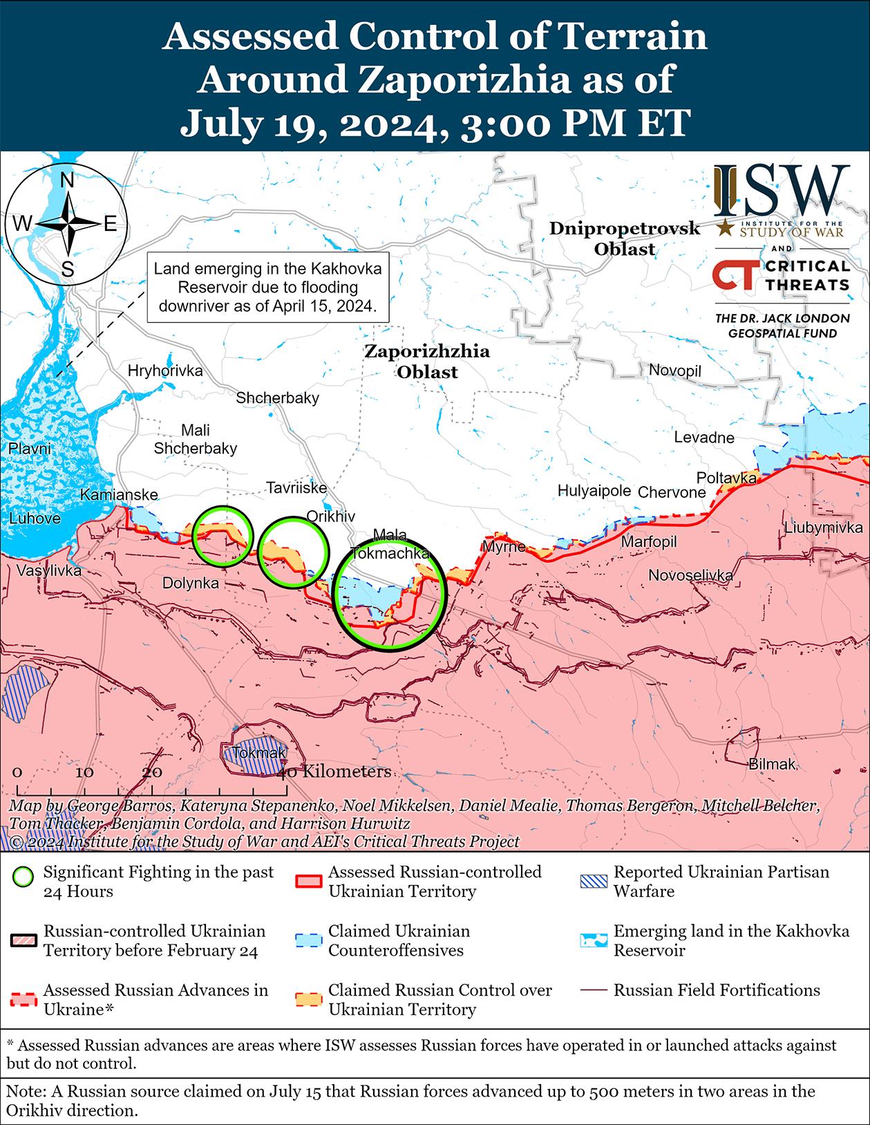 19 июля российские войска продолжили наступательные действия на участке границы Донецкой и Запорожской областей, однако подтвержденных изменений на линии фронта не было. Связанный с Кремлем российский блогер заявил 18 июля, что российские войска продвинулись к северо-востоку и северо-западу от Старомайорского (к югу от Великой Новоселки), но ISW не обнаружил визуального подтверждения этого заявления. [63] Российские военные блогеры приписывают недавний захват российскими войсками 1466-го мотострелкового полка (5-й ОА, Восточный военный округ), 40-й бригады морской пехоты (Тихоокеанский флот, ВВО) и 5-й танковой бригады (26-я ОA, ВВО) в недавнем захвате россиянами Урожайного (к югу от Великой Новоселки). [64]