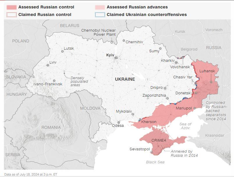 Примечания: «Оценено» означает, что Институт по изучению войны получил надежную и независимо проверяемую информацию, демонстрирующую российский контроль или наступление в этих районах. Российские наступления — это районы, где российские войска действовали или начали атаки, но они их не контролируют. «Заявленные» районы — это районы, где, по словам источников, происходит контроль или контрнаступление, но ISW не может подтвердить или доказать, что это ложь.