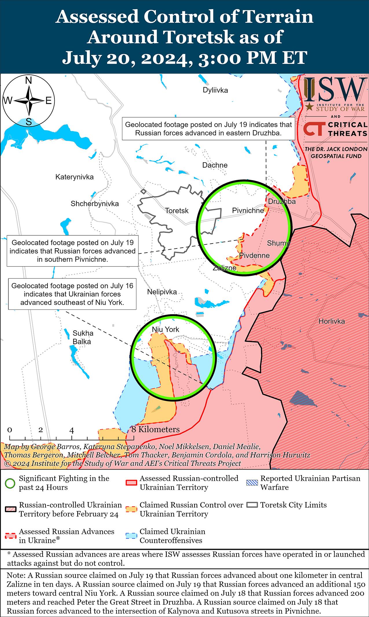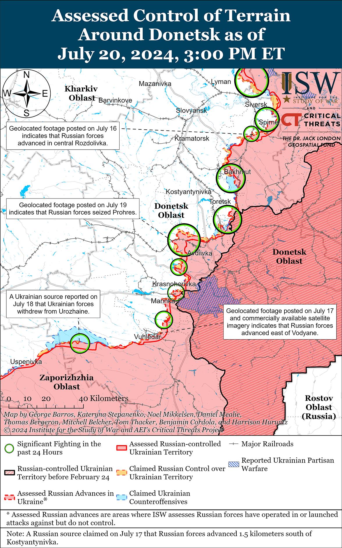 Российские войска не добились подтвержденных успехов на фоне продолжающихся боев под Торецком 20 июля. 19 и 20 июля враг продолжил наступление в районах населенных пунктов Торецк, Железное (юго-восточнее Торецка) и Нью-Йорк (южнее Торецка). [39] Российские военные блогеры утверждали, что российские войска продвинулись на полях южнее Александрополя (юго-запад Торецка) и продвинулись на глубину до 500 метров в центральной части Железного, однако ISW не обнаружил подтверждения этим заявлениям. [40] Сообщается, что подразделения российской 9-й мотострелковой бригады (1-й АК ДНР) ведут бои в районе Нью-Йорка. [41]