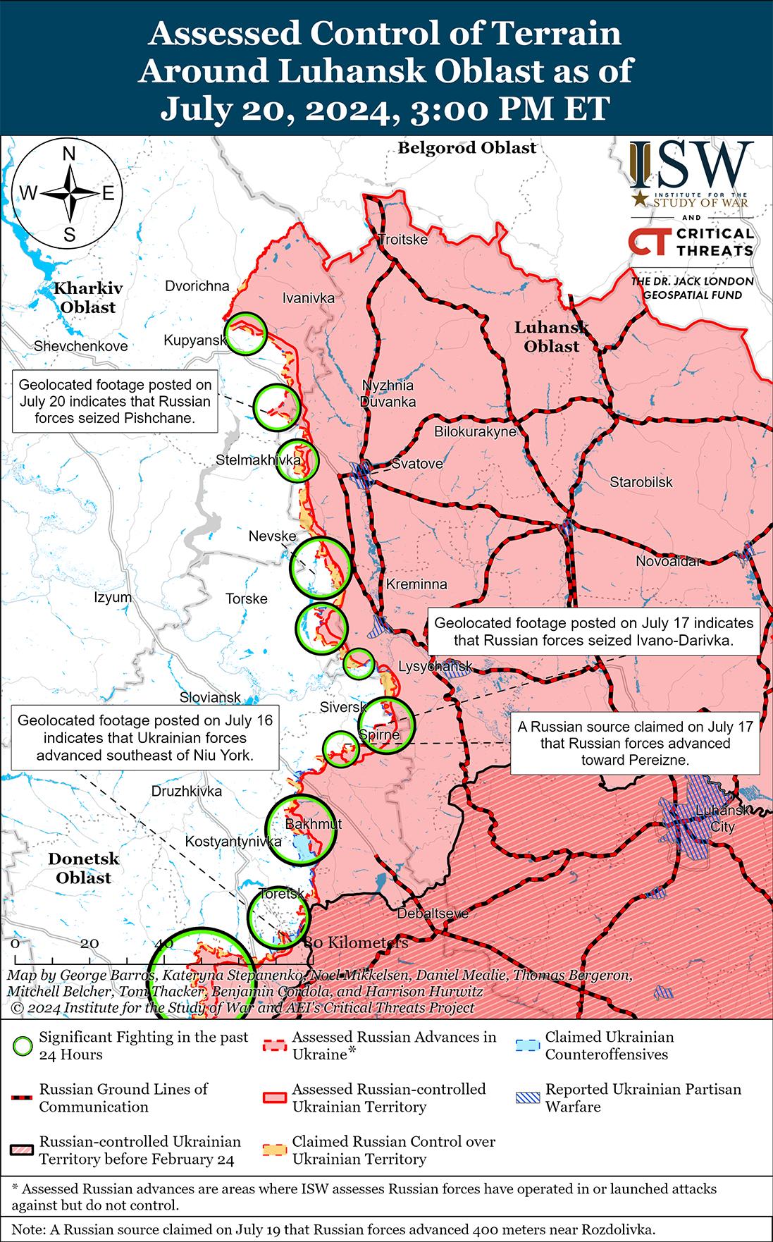 20 июля российские войска продолжили наземные атаки в районе Часового Яра, но не добились подтвержденных успехов. 19 и 20 июля враг продолжил наступление в Часовом Яру, к северу от Часового Яра в районе Калиновки и Григорьевки, к юго-востоку от Часового Яра в районе Клещеевки и к югу от Часового Яра в районе Белой Горы. [36] Сообщается, что к югу от Клещеевки ведут бои подразделения российской 98-й воздушно-десантной дивизии, а в районе Григорьевки — подразделения добровольческой бригады «Север-В». [37] Министерство обороны Соединенного Королевства (МО Великобритании) оценило, что российские войска в районе Часового Яра, вероятно, проводят тактическую паузу с проведением зондирующих атак и разведывательных операций. [38]