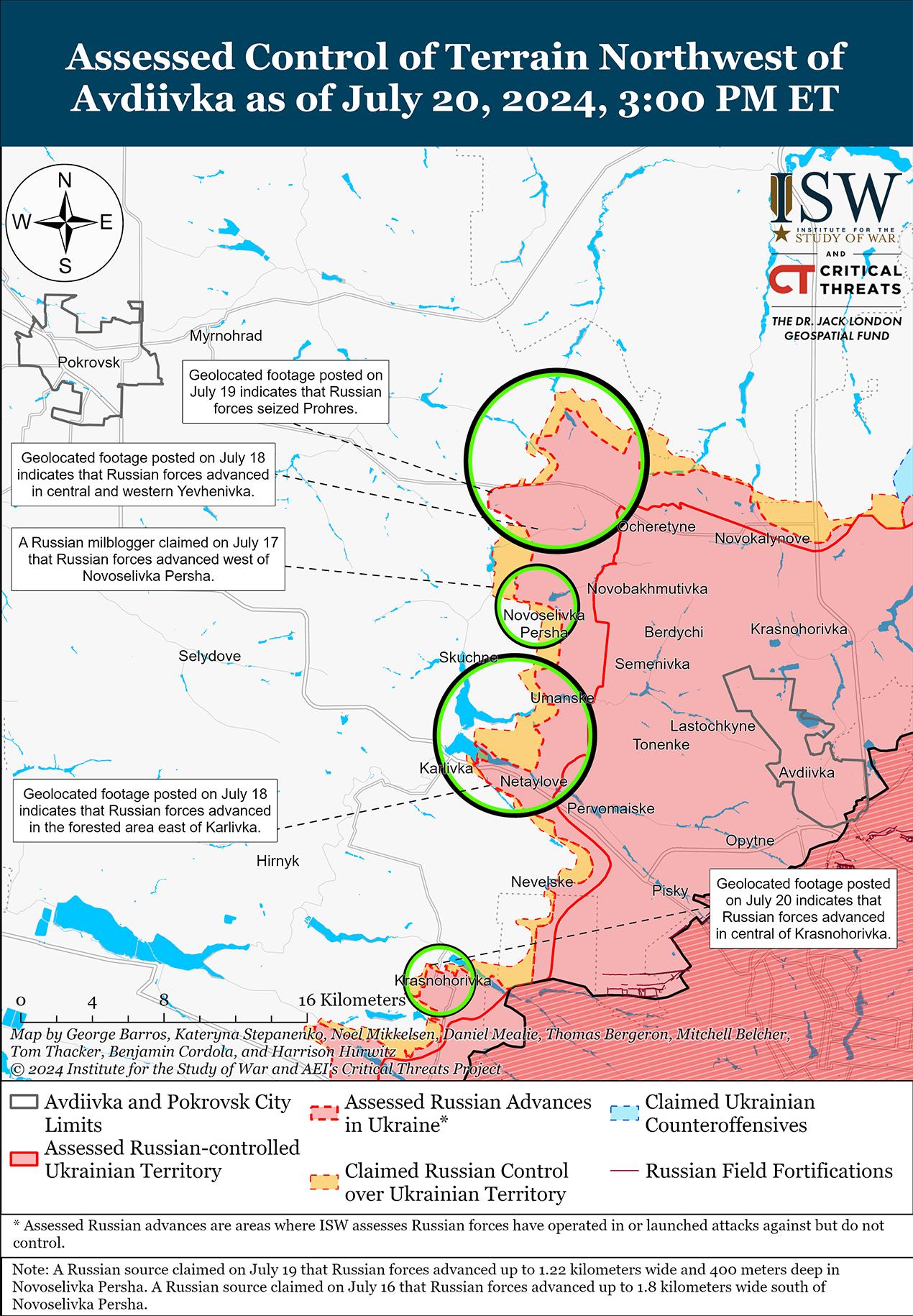 20 июля российские войска не добились подтвержденных успехов на фоне продолжающихся наступательных действий к северо-западу и западу от Авдеевки. Российские военные блогеры утверждали, что российские войска продвигаются в центральной части Новоселовки Первой (к северо-западу от Авдеевки) и что украинские войска начали отход из Новоселовки Первой, но один из блогеров утверждал, что украинские войска не отступают, а только проводят ротацию и все еще удерживают позиции на юге Новоселовки Первой. [42] Кроме того, 19 и 20 июля российские войска продолжали атаки к северо-западу от Авдеевки в районе Воздвиженки, Новоалександровки, Прогресса, Калиново, Архангельского и Скучного, а также к западу от Авдеевки в районе Яснобродовки и Карловки. [43]