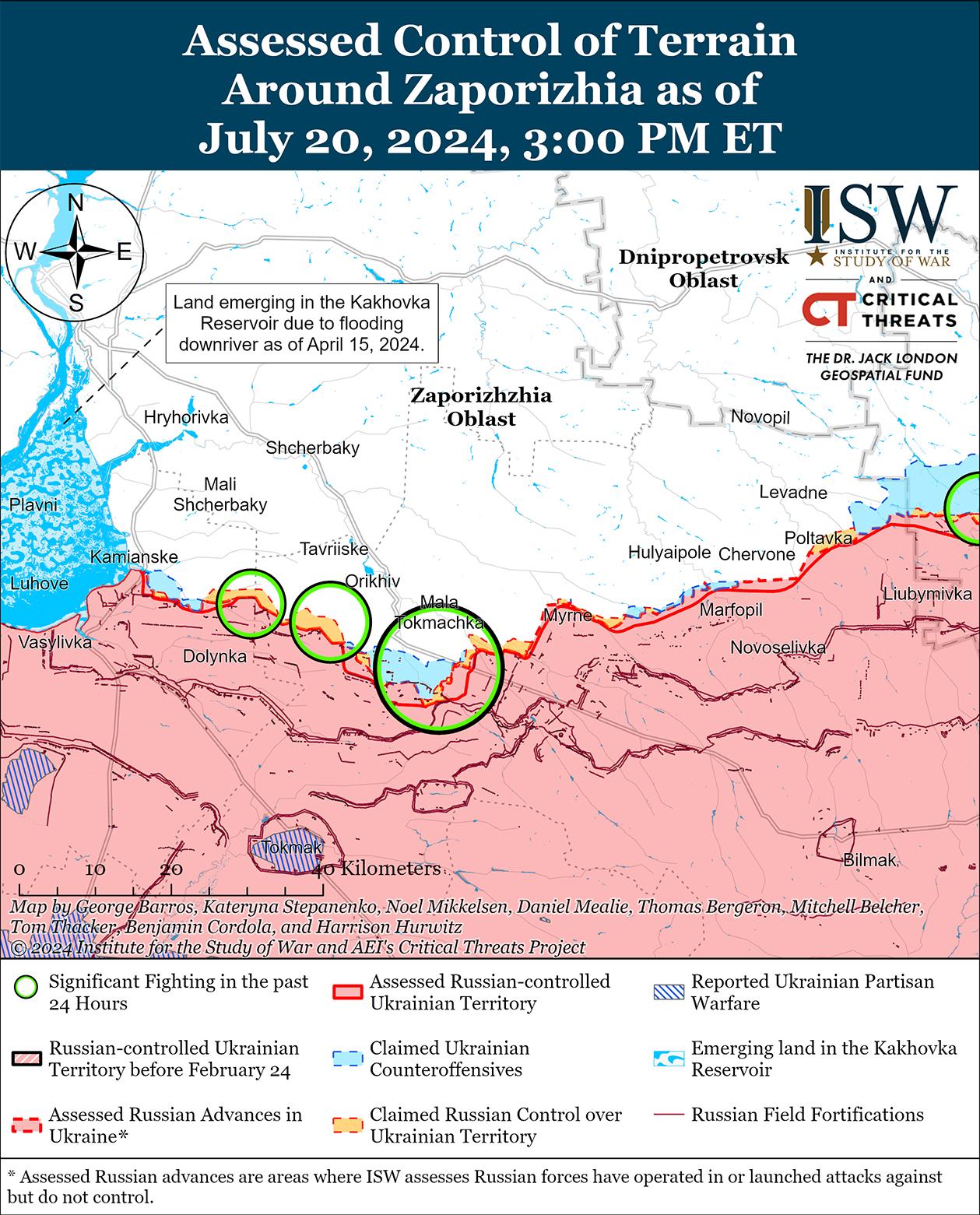 20 июля на западе Запорожской области продолжались позиционные бои, однако подтвержденных изменений на линии фронта не было. Бои продолжались в районе Работино; к востоку от Работино близ Вербовое; северо-восточнее Работино в районе Малой Токмачки; севернее Работино возле Новоданиловки; и северо-западнее Работино в районе Новоандреевки и Щербаков 19 и 20 июля. [49]