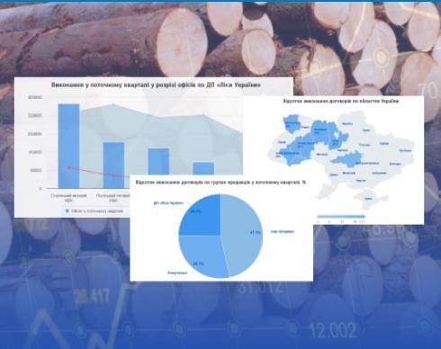 Зокрема на модулі представлена інтерактивна карта на якій позначені області в яких відбувались торги деревиною. При наведенні курсором на потрібний регіон можна побачити обсяг реалізованої сировини у м3 та відсоток виконання договорів.