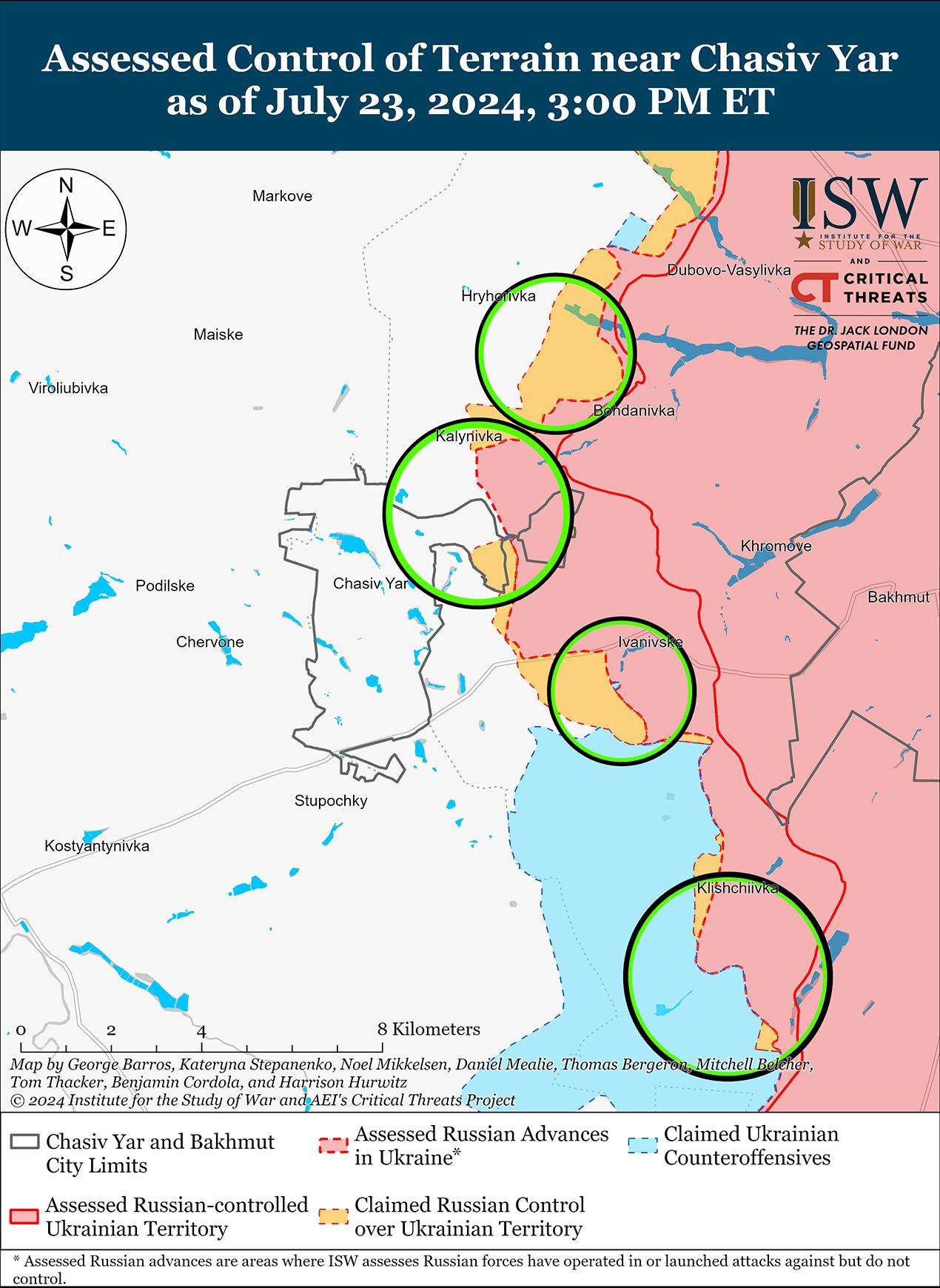 23 июля враг продолжил наступательные действия в районе Часового Яра, но подтвержденных успехов не достиг. Российские военные блогеры утверждают, что российские войска незначительно продвинулись к северу от Калиновки и возле Григорьевки (оба к северу от Часова Яра), хотя ISW не обнаружил визуального подтверждения этих утверждений. [35] По состоянию на 08:00 по местному времени 23 июля Генштаб Украины продолжал сообщать о возросшем количестве российских обстрелов в направлении Часов Яра, в частности к северу от Часова Яра в районе Васюковки, Миньковки, Орехово-Васильевки, Григоровки, Калиновки и Богдановки. [36] Также 22 и 23 июля продолжались бои к северу от Часов Яра в районе Новомаркова и к юго-западу от Часов Яра в районах Ивановского, Клещеевки, Андреевки и Белой Горы. [37] Официальный представитель украинской группировки войск «Хортица» подполковник Назар Волошин 23 июля заявил, что в районе Часова Яра действуют подразделения российской 132-й мотострелковой бригады (1-й АК Донецкой Народной Республики [ДНР]), что позволяет предположить, что российское командование привлекло к боевым действиям подразделения 132-й мотострелковой бригады как на Часов Ярском, так и на Торецком направлениях. [38] Волошин также сообщил, что враг планирует усилить подразделения, действующие на направлении Часова Яра, подразделениями двух дополнительных неустановленных бригад.