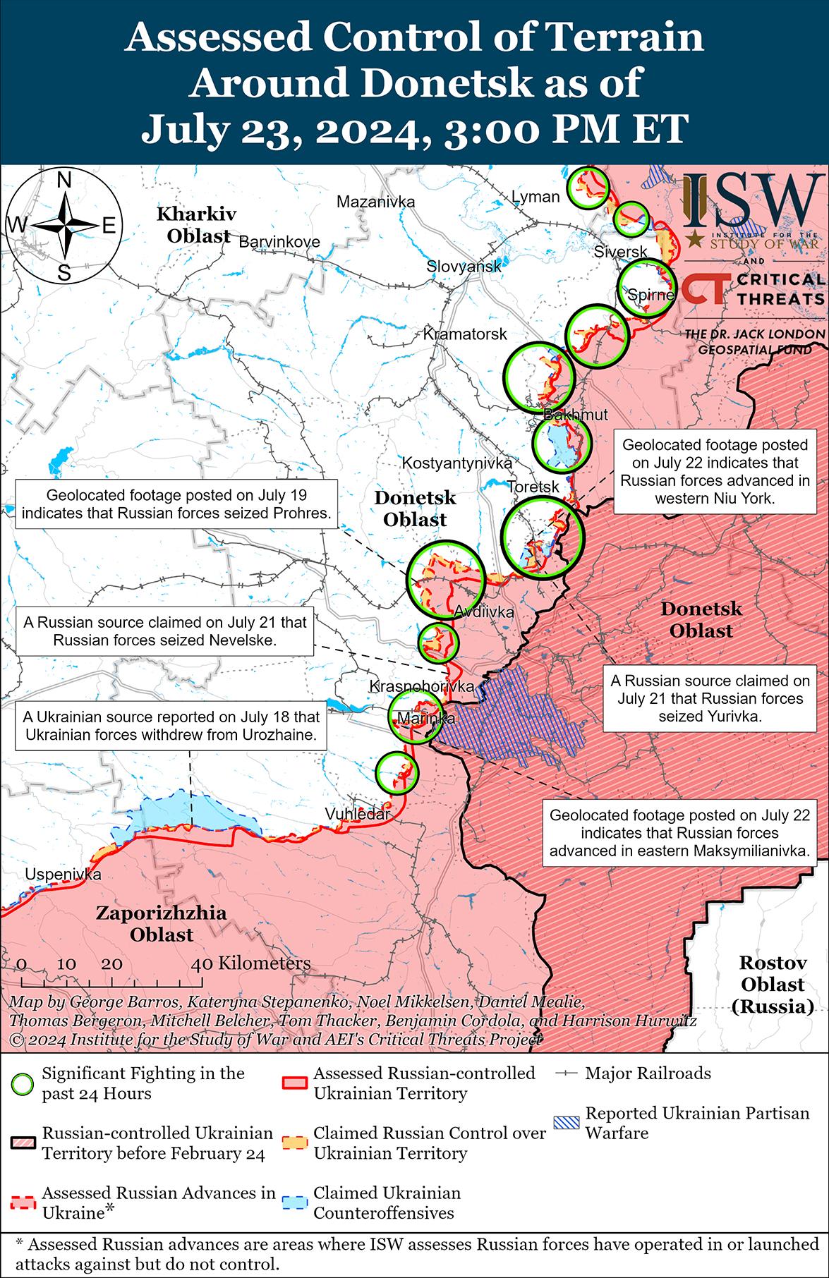 Недавно, 23 июля, российские войска продвинулись к западу от Авдеевки на фоне продолжающихся российских наступательных операций в этом районе. Геолоцированные кадры, опубликованные 23 июля, указывают на то, что российские войска недавно продвинулись к улице Молодежной на юго-западе Новоселовки Первой (к северо-западу от Авдеевки). [41] Украинский военный обозреватель Юрий Бутусов заявил 23 июля, что за последнюю неделю российские войска продвинулись на расстояние до шести километров в направлении Мирноград-Покровск (к северо-западу от Авдеевки), и отметил, что российские войска находятся в 14 километрах от Мирнограда, что согласуется с оценкой ISW российских успехов в этом районе. [42] Бутусов заявил, что украинские войска находятся в «критически сложном» положении на Покровском (Авдеевском) направлении, и отметил, что российские войска пытаются атаковать наиболее деградировавшие украинские подразделения в этом районе, а не нацеливаться на самые слабые оборонительные позиции. Бутусов также заявил, что на Авдеевском направлении враг ведет небольшие лобовые штурмы силами пехоты. Российские военные блогеры утверждают, что российские войска продвинулись к окраинам Вовчи (к северо-западу от Авдеевки) и к северному и южному берегам Карловского водохранилища (к западу от Авдеевки), хотя ISW не видел визуальных доказательств российских успехов в этих районах. [43] Бои продолжались к северу от Авдеевки в районе Калиново; к северо-западу от Авдеевки в районах населенных пунктов Воздвиженка, Новоалександровка, Ивановка, Тимофеевка, Лозувацкое, Прогресс, Новоселовка Первая и Вовча; и к западу от Авдеевки в районе Яснобродовки, Уманского и Карловки 22 и 23 июля. [44] 23 июля украинские военные источники опубликовали кадры, на которых украинские войска сбивают российский штурмовик Су-25 на Покровском направлении. [45]