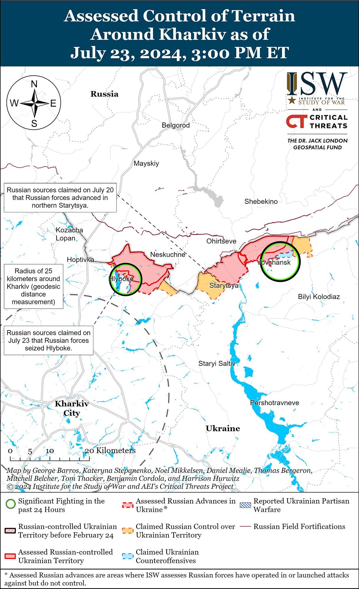 22 и 23 июля российские войска продолжили локальные наступательные действия к северу и северо-востоку от Харькова. Российские источники утверждают, что российские войска полностью оттеснили украинские войска от Глубокого (к северу от Харькова) и обратно на расстояние до одного километра, хотя ISW пока не обнаружил визуальных доказательств, подтверждающих, что российские войска контролируют все Глубокое. [19] Российский военный блогер утверждал, что российские войска нанесли авиаудары между Липцами и Глубоким, в результате чего украинские войска отступили и пополнили резервы. [20] Российский военный блогер утверждал, что удары российской артиллерии и беспилотников с видом от первого лица (FPV) отразили несколько попыток украинских контратак в районе Глубокого. [21] Сообщается, что Воздушно-космические силы (ВКС) России нанесли удар объемно-детонирующей авиабомбой ОДАБ-1500 по украинским силам вблизи Борщовой (к северу от Харькова и к югу от Глубокого). [22] 22 и 23 июля продолжались позиционные бои в районах населенных пунктов Глубокое, Волчанск (к северо-востоку от Харькова), Волчанские Хуторы и Тихое (оба к востоку от Волчанска). [23] Российский военный блогер заявил, что украинские войска активизируются в районе Старицы (к юго-западу от Волчанска). [24] Официальный представитель Харьковской областной группировки войск полковник Виталий Саранцев 23 июля заявил, что российские войска сосредотачивают основные усилия в районе Глубокого и Волчанска и продолжают перегруппировываться для ведения штурмовых действий, но не готовятся к новой наступательной операции. [25] В Харьковской областной группировке войск заявили, что подразделения 7-го мотострелкового полка (11-й армейский корпус, Ленинградский военный округ) готовятся к возобновлению наступательных действий в районе Лукьянцев (севернее Харькова). [26] На Харьковском направлении действуют подразделения 128-й мотострелковой бригады (44-й АК, ЛВО), 138-й мотострелковой бригады (6-я общевойсковая армия, ЛВО), 18-й мотострелковой дивизии (11-й АК, Балтийский флот) и 155-й бригады морской пехоты (Тихоокеанский флот) российских войск. [27]