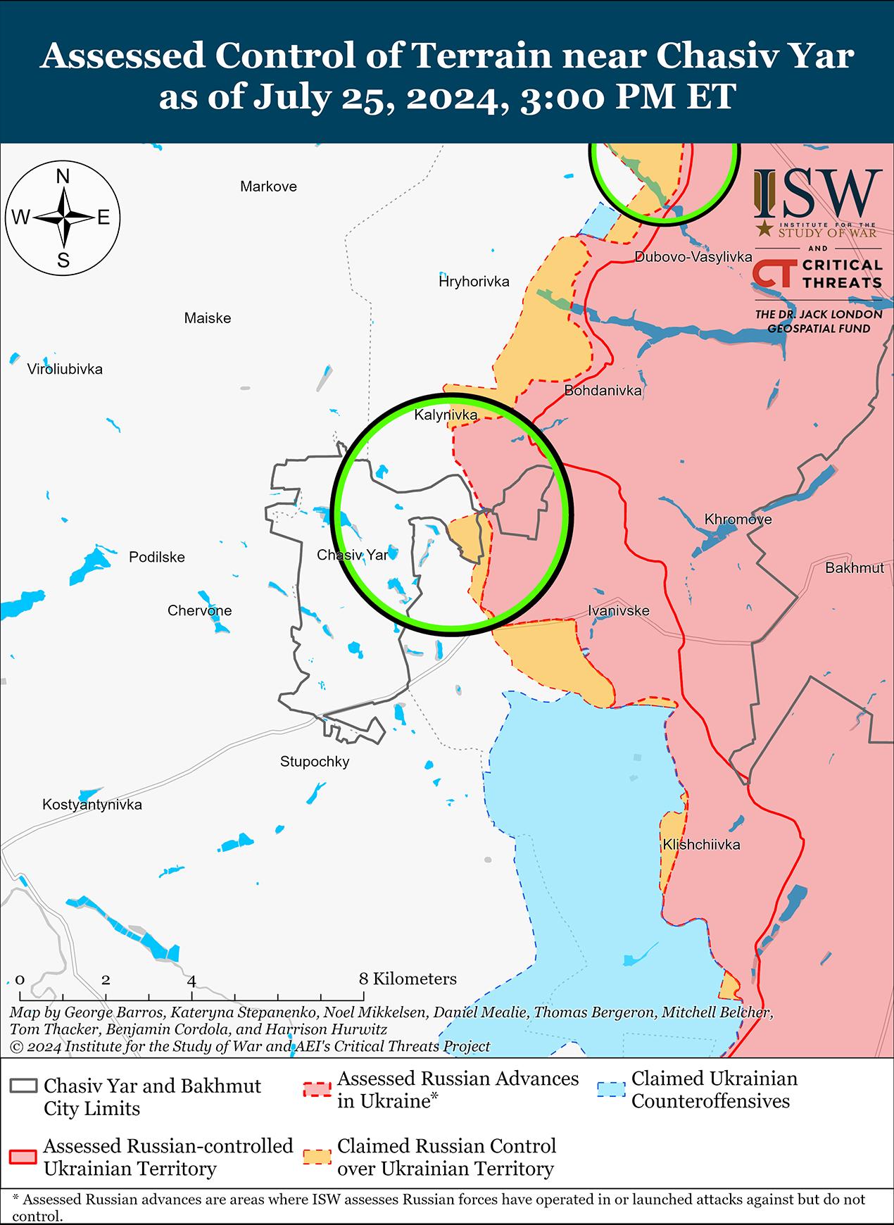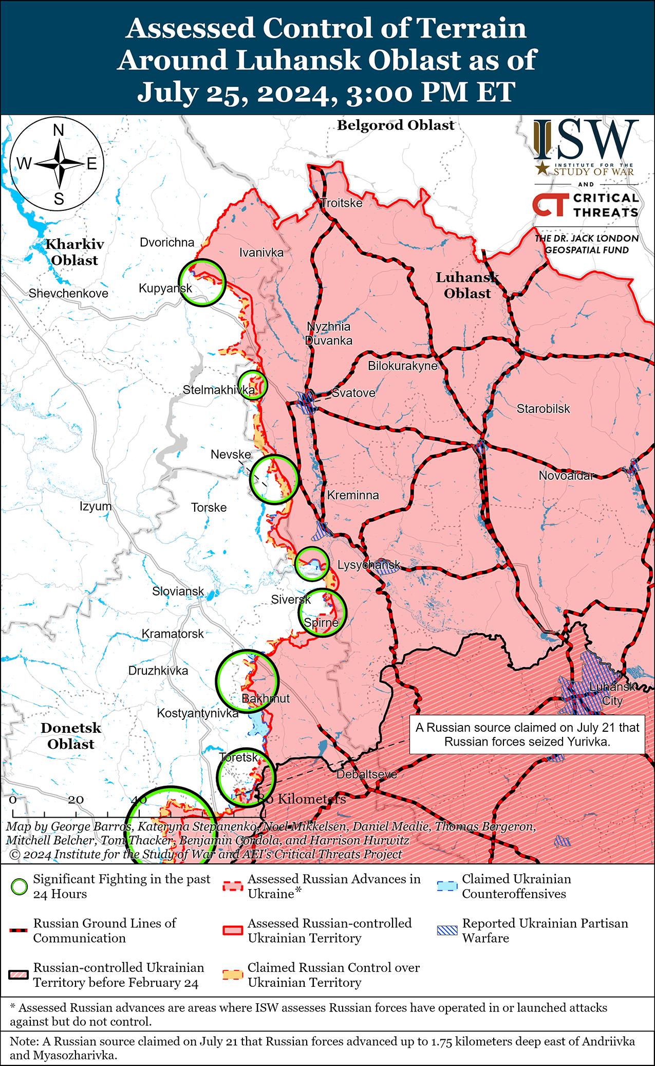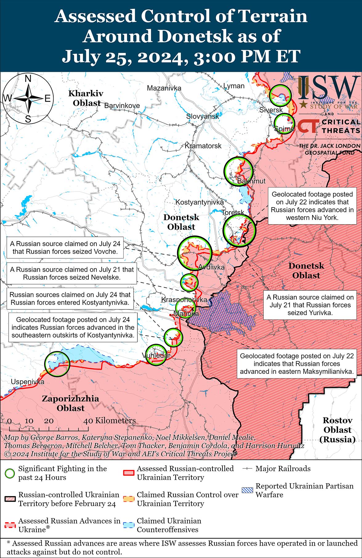 В последнее время российские войска продвинулись под Торецком и 25 июля продолжили наступательные действия в этом районе. Геолоцированные кадры, опубликованные 25 июля, указывают на то, что российские войска в последнее время продвинулись вдоль улицы Славной в северном Железном (к юго-востоку от Торецка) и вдоль улицы Запорожской в центре Железного. [53] Российские войска продолжили наступательные действия к северу от Торецка в районе Дачного; восточнее Торецка в районе Северного и Дружбы; юго-восточнее Торецка в районе Железного; и южнее Торецка в районе Ню-Йорка 24 и 25 июля. [54]